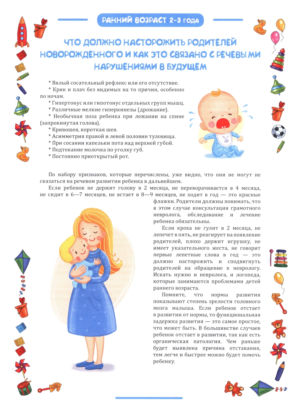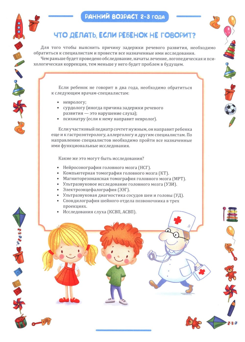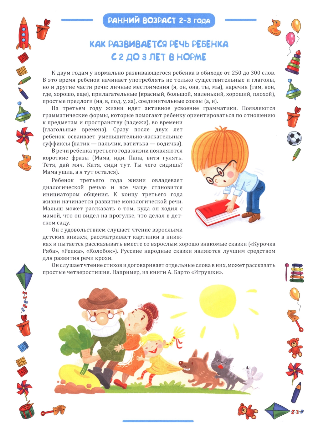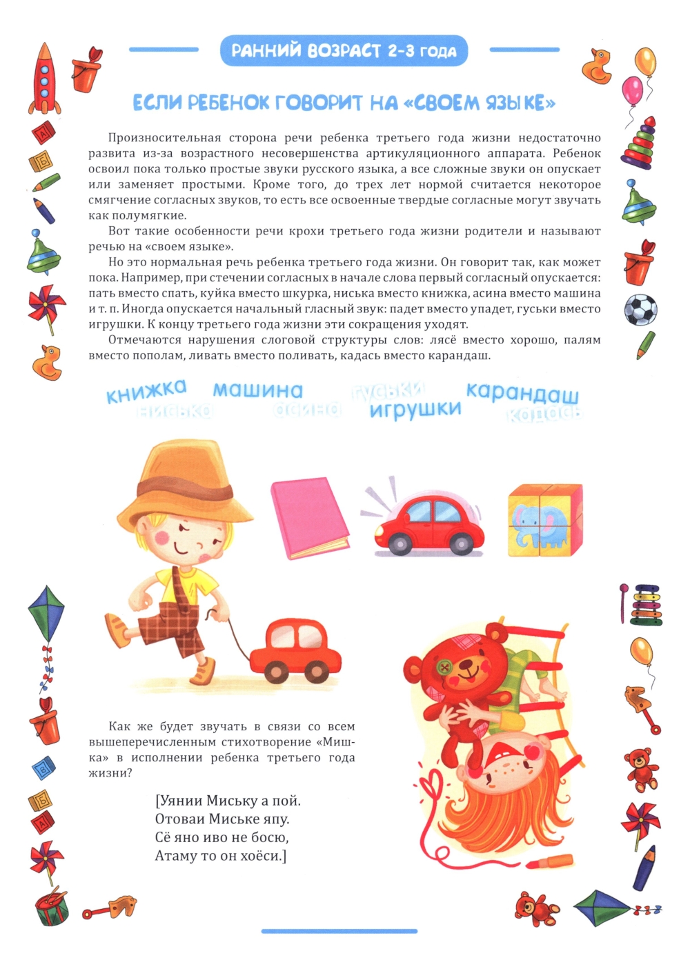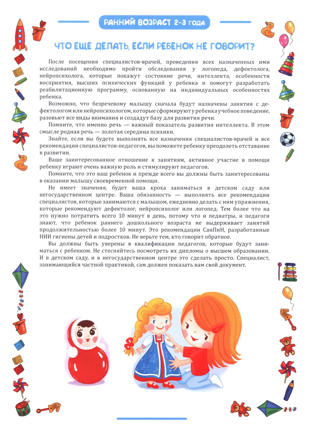В методическом пособии содержатся материалы для оформления папки-передвижки в раздевалке группы для детей раннего дошкольного возраста (с 2 до 3 лет). Это советы родителям тех детей, у которых к двум годам в активной речи мал запас слов, отсутствуют простые предложения, недостаточное понимание обращенной речи. Родители получают информацию о том, к каким специалистам нужно обратиться, чтобы выявить причину в отставании развития речи малыша, какие исследования могут быть назначены ребенку, с какими специалистами стоит заниматься крохе, как правильно организовать с ним развивающие занятия дома. Рекомендовано родителям дошкольников, педагогам ДОУ и детских развивающих центров.| Издательство | Детство-Пресс |