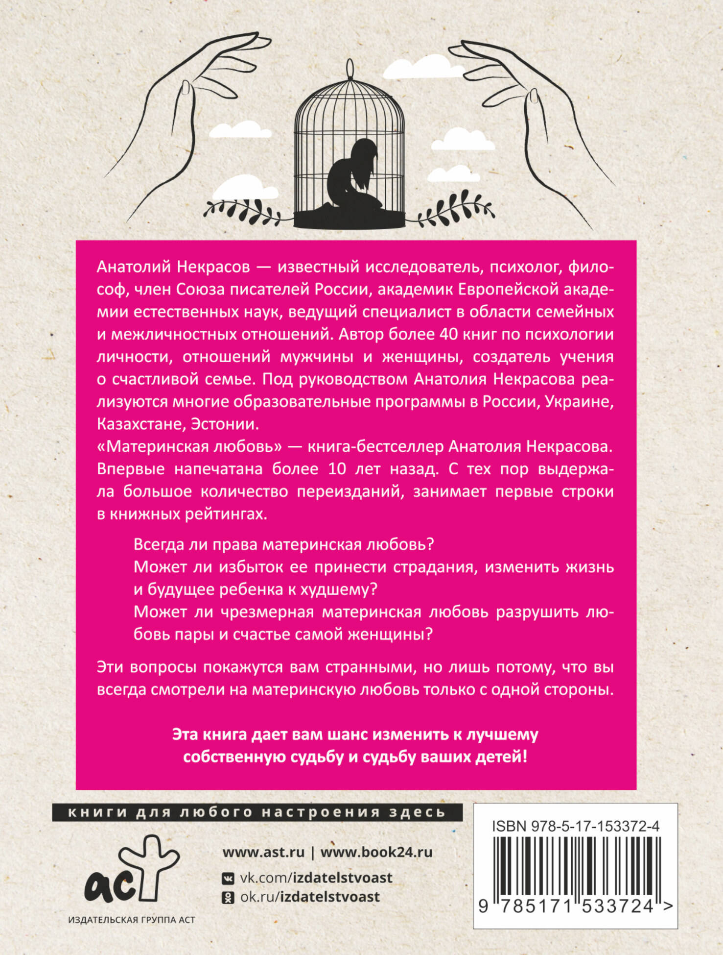 Перед вами новое издание знаменитого бестселлера Анатолия Некрасова "Материнская любовь". Эта книга выдержала десятки переизданий, о ней написаны сотни читательских отзывов. "Меняет жизнь!", "Открывает глаза!", "Путь из тупика" - вот что чаще всего говорят об этой книге читатели. Вы узнаете о материнской любви, в том числе и о тех ее проявлениях, которые приносят множество страданий и горя и родителям, и детям, и обществу в целом. Вам покажется это странным, но вы просто не смотрели на материнскую любовь "с другой стороны". Исследований такой глубины на эту тему еще не было. Эта книга - для каждой семьи, потому что показывает, в чем истинная причина семейных проблем и какую "работу над ошибками" нужно сделать, чтобы стать счастливым и успешным. Автор этой книги, Анатолий Некрасов - известный исследователь, психолог, философ, член Союза писателей России, академик Европейской академии естественных наук, ведущий специалист в области семейных и межличностных отношений. Автор более 40 книг по психологии личности, отношений мужчины и женщины, создатель учения о счастливой семье. Под руководством Анатолия Некрасова реализуются многие образовательные программы в России, Украине, Казахстане, Эстонии.| Издательство | ИЗДАТЕЛЬСТВО "АСТ" |