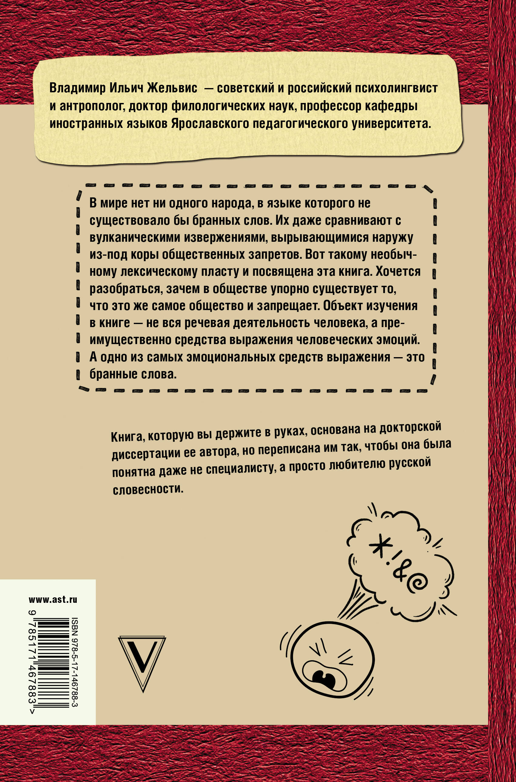 Владимир Ильич Жельвис - советский и российский психолингвист и антрополог, доктор филологических наук, профессор кафедры иностранных языков Ярославского педагогического университета. В мире нет ни одного народа, в языке которого не существовало бы бранных слов. Их даже сравнивают с вулканическими извержениями, вырывающимися наружу из-под коры общественных запретов. Вот такому необычному лексическому пласту и посвящена эта книга. Хочется разобраться, зачем в обществе упорно существует то, что это же самое общество и запрещает. Объект изучения в книге - не вся речевая деятельность человека, а преимущественно средства выражения человеческих эмоций. А одно из самых эмоциональных средств выражения - это бранные слова. Книга основана на докторской диссертации ее автора, но переписана им так, чтобы она была понятна даже не специалисту, а просто любителю русской словесности.| Издательство | АСТ |