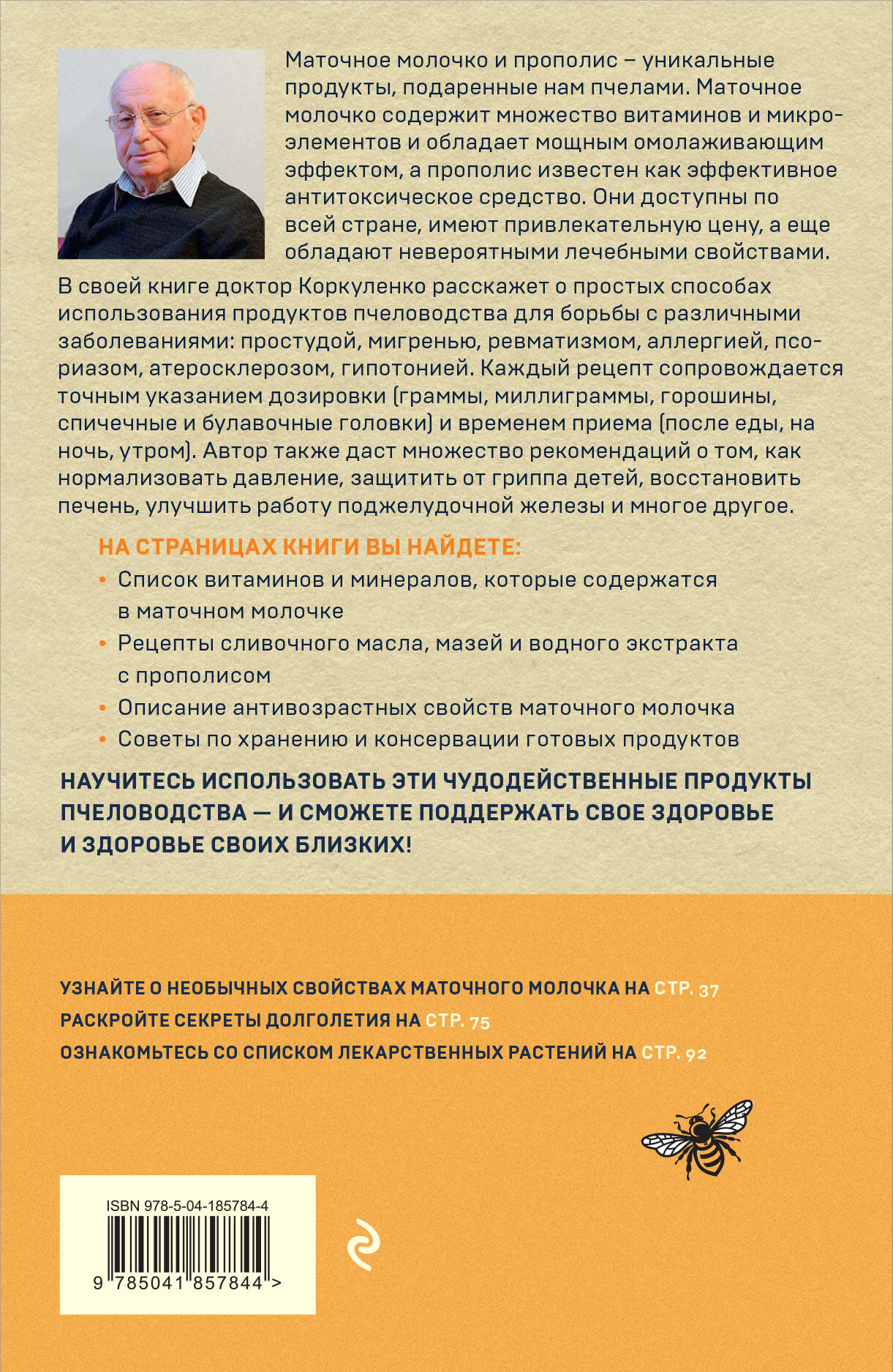 Маточное молочко и прополис давно известны в народной медицине как лучшие средства для укрепления иммунитета. В своей книге Игорь Коркуленко подробно расскажет о свойствах этих чудодейственных продуктов, даст инструкции по их использованию и поделится эффективными способами борьбы с различными заболеваниями. Благодаря книге вы узнаете, как эффективно избавиться от заболеваний, среди них: анемия, аденовирусная инфекция, дисбактериоз кишечника, панкреатит, язва, атеросклероз, мигрень и многие другие. Новое оформление книги «Маточное молочко. Эликсир от Королевы пчел».| Издательство | ООО "Издательство "Эксмо" |