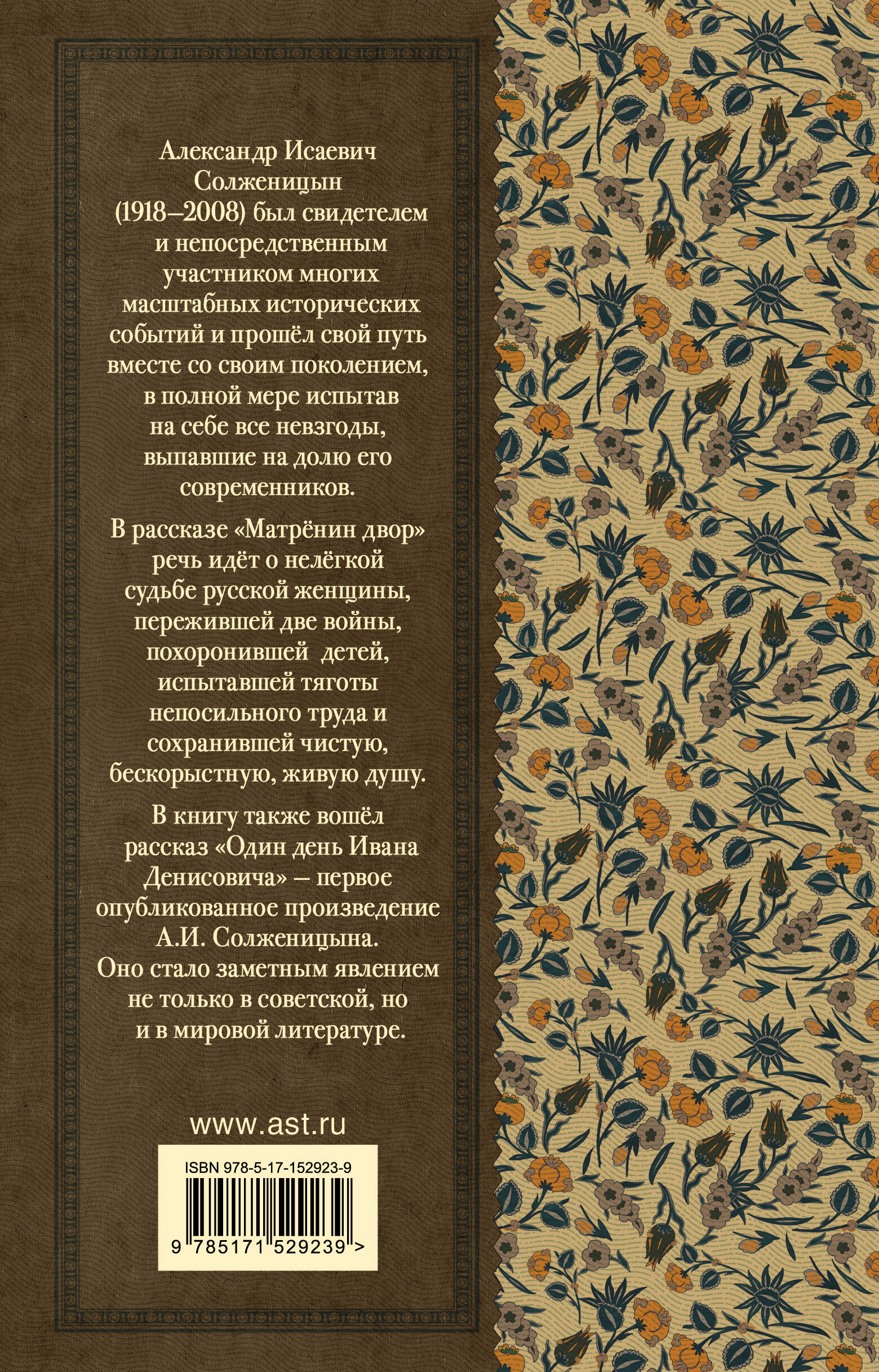 Александр Исаевич Солженицын (1918-2008) был свидетелем и непосредственным участником многих масштабных исторических событий и прошёл свой путь вместе со своим поколением, в полной мере испытав на себе все невзгоды,выпавшие на долю его современников. В рассказе "Матрёнин двор" речь идёт о нелёгкой судьбе русской женщины, пережившей две войны, похоронившей детей, испытавшей тяготы непосильного труда и сохранившей чистую, бескорыстную, живую душу. В книгу также вошёл рассказ "Один день Ивана Денисовича" - первое опубликованное произведение А.И. Солженицына. Оно стало заметным явлением не только в советской, но и в мировой литературе.