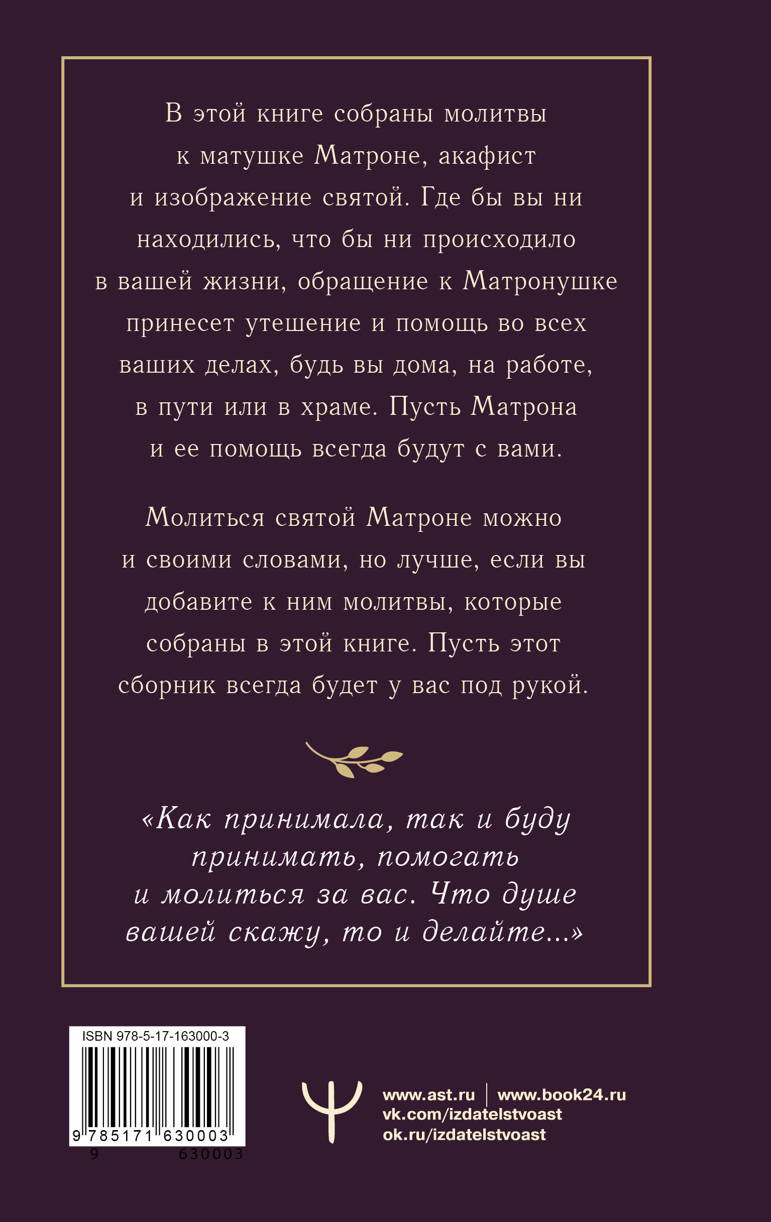 Когда кажется, что выхода нет, мы надеемся на чудо. "Матронушка" - так в народе называют одну из самых почитаемых православных святых Матрону Московскую. Матрона помогала людям в самые непростые для русского народа времена: во время войн и революции она всегда была рядом с теми, кто обращался к ней. Матрона спасала каждого, кто к ней приходил: исцеляла, утешала и давала добрый совет. И даже после своей смерти Матронушка продолжает защищать нас. Она дает каждому то, что он просит: исцеление болеющим, утешение скорбящим. Нужно лишь попросить ее о помощи. В этой книге вы найдете молитвы, которые помогут вам обратиться к святой, а также ее житие, святой образ и акафист. Эта книга поможет всем, кто: · страдает различными недугами; · не может завести семью; · сталкивается с неудачами на работе, учебе или в личной жизни; · столкнулся с бытовыми трудностями; · не может наладить отношения с близкими; · скорбит о потере; · утратил спокойствие и веру в себя. От всего сердца просите у Матроны то, в чем нуждаетесь, и обретете помощь и защиту! Книга в твердой обложке.| Издательство | Издательство "АСТ" |