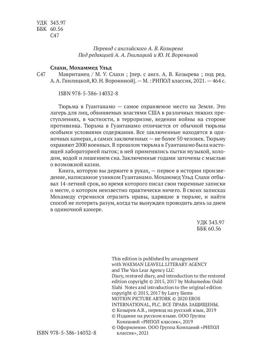Тюрьма в Гуантанамо - самое охраняемое место на Земле. Это лагерь для лиц, обвиняемых властями США в различных тяжких преступлениях, в частности, в терроризме, ведении войны на стороне противника. Тюрьма в Гуантанамо отличается от обычной тюрьмы особыми условиями содержания. Все заключенные находятся в одиночных камерах, а самих заключенных - не более 50 человек. Тюрьму охраняют 2000 военных. В прошлом тюрьма в Гуантанамо была настоящей лабораторией пыток; в ней применялись пытки музыкой, холодом, водой и лишением сна. Заключенные годами заточены с мыслью о возможной казни. Книга, которую вы держите в руках, - первое в истории произведение, написанное узником Гуантанамо. Мохаммед Ульд Слахи отбывал 14-летний срок, во время которого писал свои тюремные записки о месте, о котором неизвестно практически ничего. В своих записках Мохамеду стремился отразить нравы, царящие в тюрьме, и найти способ не потерять разум, когда ты вынужден проводить день за днем в одиночной камере.| Издательство | Рипол Классик |