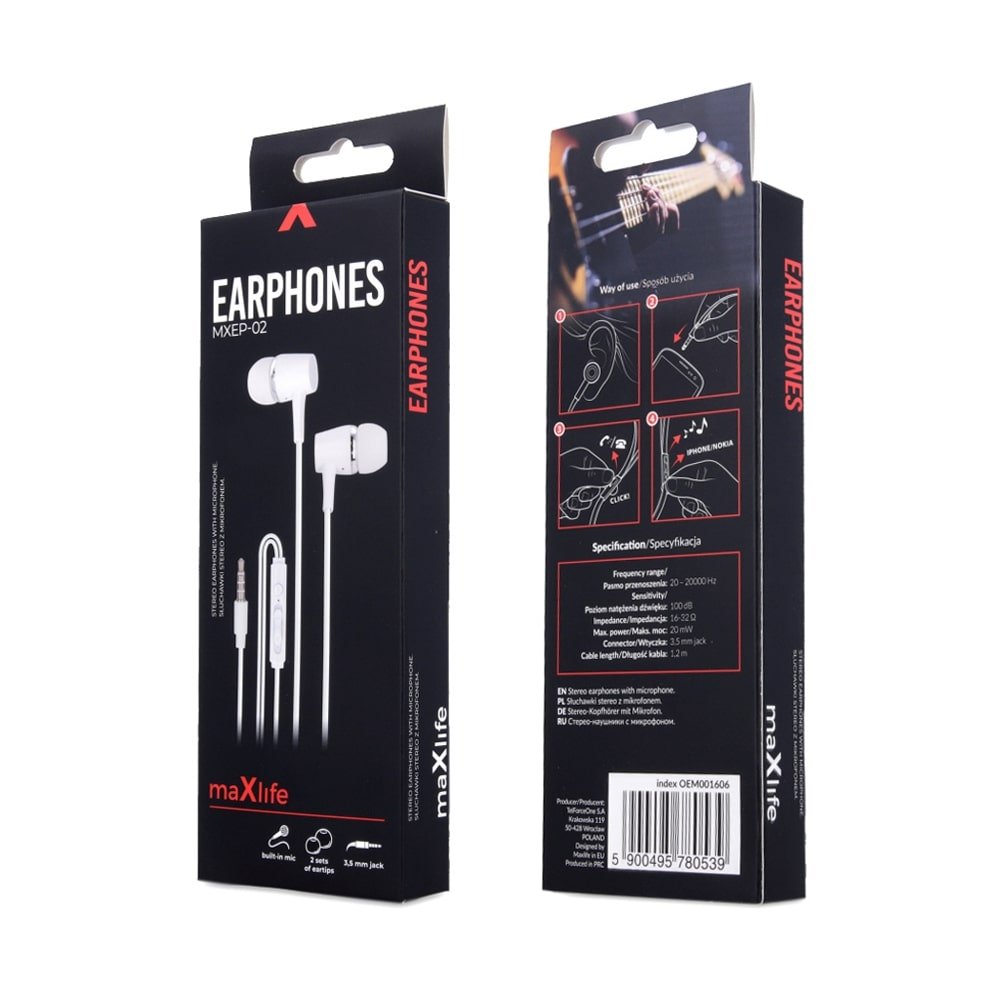 <p>Проводные наушники Макслайф. Берите с собой любимую музыку в каждую поездку. Удобные наушники обеспечивают идеальную посадку и комфорт во время использования, кабель длиной 1,2 м подарит вам полную свободу, а контроллер со встроенным динамиком позволит говорить по телефону, пока у вас занята рука.</p><br /> <p>Цвет: белый<br>Длина кабеля: 1,2 м<br>Нежность: 100 дБ<br>Разъем: 3,5 мм (мини-джек)<br>Торговая марка: Макслайф<br>Микрофон: да<br>Частотная характеристика: 20 Гц - 20 кГц<br>Модель: MXEP-02<br>Импеданс: 16-32 Ом</p><br /> <p><br><br></p>