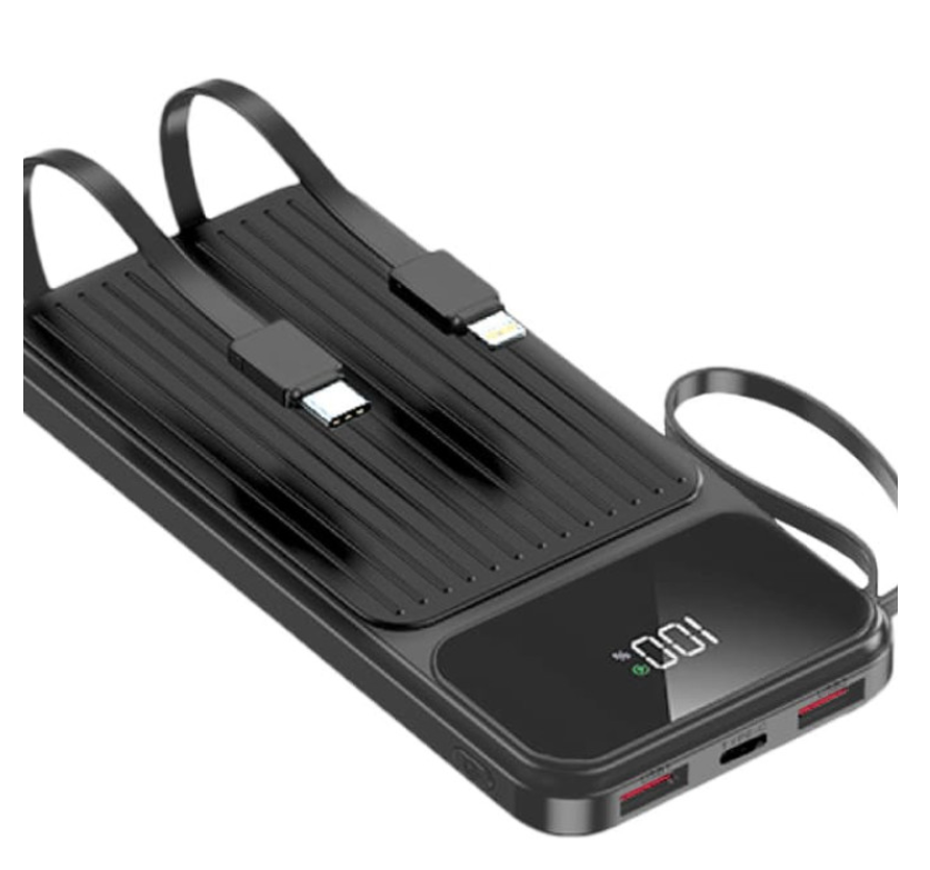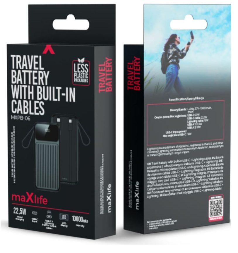 <p>Внешний аккумулятор Maxlife MXPB-06 со встроенными кабелями - 10000 мАч, PD/QC 22,5 Вт, черный<br>Встроенные кабели USB-C и Lightning<br>Поддержка быстрой зарядки: PD и QC до 22,5 Вт<br>Вход/выход USB-C (макс. 20 Вт)<br>Выходная мощность кабеля USB-C: макс. 22,5 Вт<br>Выходная мощность кабеля Lightning: макс. 10 Вт<br>Выход USB-A 1: макс. 22,5 Вт<br>Выход USB-A 2: макс. 10 Вт<br>Светодиодный дисплей показывает оставшийся уровень заряда батареи<br>Тонкий и портативный дизайн<br>Емкость аккумулятора: 10000 мАч (литий-полимерный)<br>Цвет: Черный<br>Масса нетто: ~0,18 кг<br>Вес брутто: ~0,25 кг<br>Размеры упаковки: прибл. 0,17 × 0,09 × 0,03 м</p>