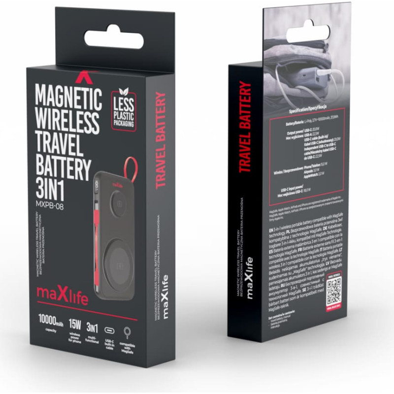<p data-start="149" data-end="535">Внешний аккумулятор Maxlife MXPB-08 обеспечивает удобную и быструю зарядку ваших устройств. Благодаря встроенной магнитной технологии он совместим с MagSafe и позволяет беспроводную зарядку. Ёмкость 10000 mAh обеспечивает несколько циклов подзарядки для смартфона или наушников. Компактный корпус и лёгкий вес делают устройство идеальным для повседневного использования и путешествий.</p><br /> <p data-start="537" data-end="1137"><strong data-start="537" data-end="556">Характеристики:</strong><br data-start="556" data-end="559">Модель: MXPB-08<br data-start="574" data-end="577">Тип: Внешний аккумулятор<br data-start="601" data-end="604">Ёмкость: 10000 mAh<br data-start="622" data-end="625">Тип зарядки: Проводная и беспроводная<br data-start="662" data-end="665">Совместимость: Устройства с поддержкой MagSafe и Qi<br data-start="716" data-end="719">Количество портов: 2 (USB-A, USB-C)<br data-start="754" data-end="757">Входное напряжение: 5 V/2 A<br data-start="784" data-end="787">Выходное напряжение: 5 V/2.1 A<br data-start="817" data-end="820">Беспроводная мощность: до 15 W<br data-start="850" data-end="853">Функции: Магнитное крепление, защита от перегрева и перенапряжения<br data-start="919" data-end="922">Интерфейс: USB-C<br data-start="938" data-end="941">Материал корпуса: Пластик (ABS)<br data-start="972" data-end="975">Цвет: Чёрный<br data-start="987" data-end="990">Год модели: 2025<br data-start="1006" data-end="1009">Назначение: Универсальный, Для путешествий, Для работы, Для дома<br data-start="1073" data-end="1076">Комплектация: Внешний аккумулятор, кабель USB-C, инструкция</p><br /> <p data-start="1139" data-end="1275"><strong data-start="1139" data-end="1164">Физические параметры:</strong><br data-start="1164" data-end="1167">Вес: 0.18 кг<br data-start="1179" data-end="1182">Вес брутто: 0.20 кг<br data-start="1201" data-end="1204">Размеры упаковки<br data-start="1220" data-end="1223">Длина, м: 0.12<br data-start="1237" data-end="1240">Высота, м: 0.18<br data-start="1255" data-end="1258">Ширина, м: 0.03</p>