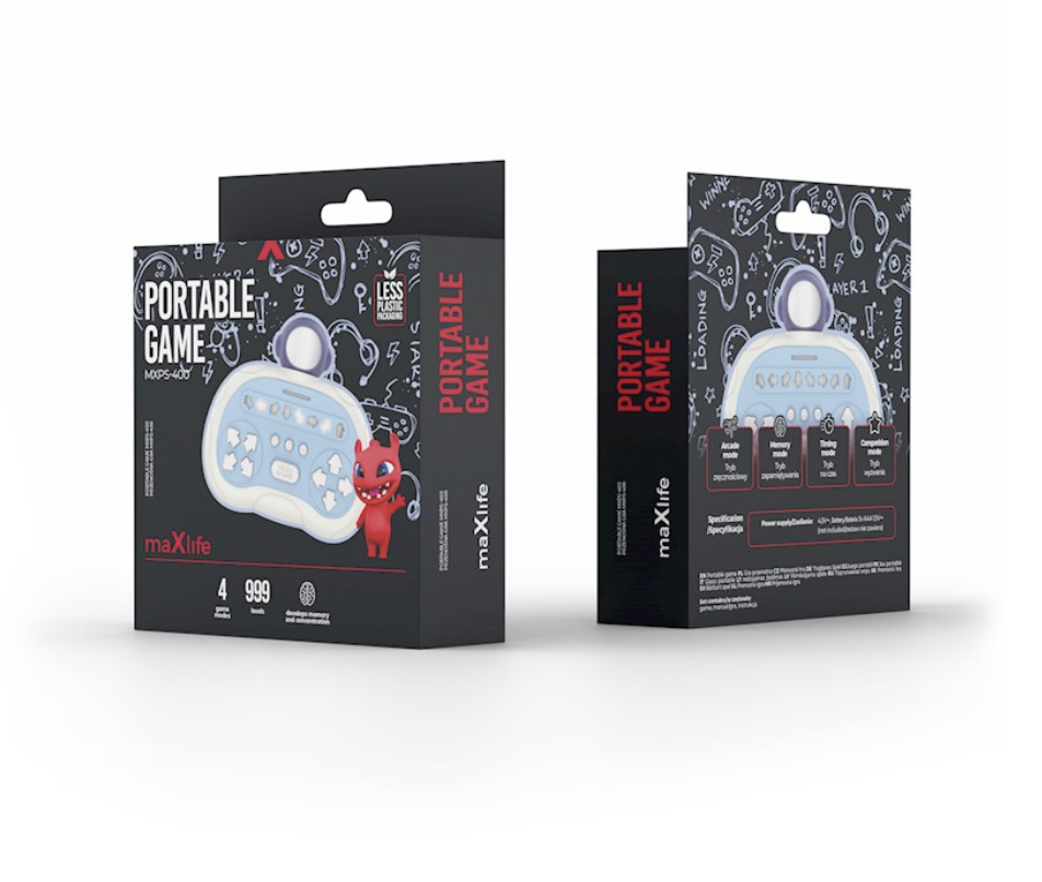 <p>Maxlife MXPS-400 это электронная игра для развития навыков с компактным дизайном и динамичной механикой. Устройство способствует развитию рефлексов, концентрации внимания и зрительно-моторной координации, предлагая увлекательный игровой процесс в четырёх различных режимах. Благодаря портативному формату игру можно использовать как дома, так и в поездках.</p><br /> <p>Космический дизайн и характерная голова астронавта</p><br /> <p>Главной особенностью модели MXPS-400 является эффектная голова астронавта, расположенная в верхней части корпуса. Этот элемент привлекает внимание и придаёт устройству современный, по-детски футуристический вид. Яркие цвета и эргономичная форма обеспечивают удобное расположение игры в руках и эстетическую привлекательность для юных пользователей.</p><br /> <p>Четыре игровых режима - разные уровни сложности</p><br /> <p>Maxlife MXPS-400 предлагает четыре игровых режима, которые развивают память, рефлексы и скорость реакции. Разнообразие заданий и уровней сложности помогает дольше удерживать интерес и подстраивать темп игры под индивидуальные навыки. Световые и звуковые эффекты усиливают удовольствие и способствуют быстрой реакции на стимулы.</p><br /> <p>Прочная конструкция и удобство использования</p><br /> <p>Корпус изготовлен из прочных и безопасных материалов. Тщательно проработанные детали и кнопки с ощутимым щелчком повышают комфорт использования. Благодаря компактным размерам устройство легко помещается в сумку или рюкзак, занимая мало места и всегда оставаясь под рукой.</p>