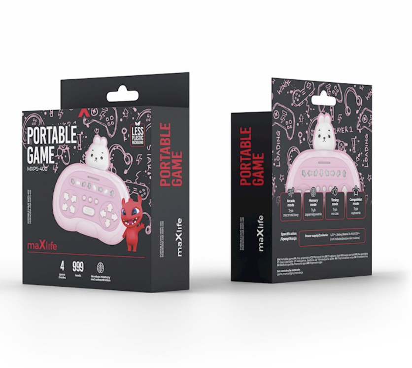 <p>Maxlife MXPS-400 это компактная игра для развития навыков, разработанная для активного и развивающего времяпрепровождения. Устройство <strong>развивает рефлексы, концентрацию внимания и зрительно</strong>-моторную координацию благодаря динамичному игровому процессу в четырёх режимах с разным уровнем сложности. Удобный дизайн позволяет играть где угодно - дома, в дороге или на переменах в школе.</p><br /> <p><strong>Очаровательный дизайн с изображением зайчика</strong></p><br /> <p>Розовый корпус дополнен характерной мордочкой зайчика, которая придаёт устройству дружелюбный и игривый вид. Графические детали и плавные округлые формы делают устройство визуально привлекательным и особенно любимым детьми младшего возраста. Компактная конструкция идеально ложится в руку, что повышает удобство использования.</p><br /> <p><strong>Четыре игровых режима - динамичные задачи и развитие навыков</strong></p><br /> <p>MXPS-400 предлагает четыре различных режима, включая упражнения на память и реакцию. Каждый из них побуждает пользователя быстро реагировать на визуальные и слуховые сигналы, что способствует развитию логического мышления и мелкой моторики. Разнообразие уровней сложности мотивирует к постоянному улучшению результатов.</p><br /> <p>Прочная конструкция и безопасное использование</p><br /> <p>Корпус изготовлен из безопасных материалов, устойчивых к повреждениям и интенсивному использованию. Кнопки чувствительны и удобно расположены, что повышает комфорт использования. Компактные размеры устройства позволяют легко хранить и переносить его, не занимая много места.</p>