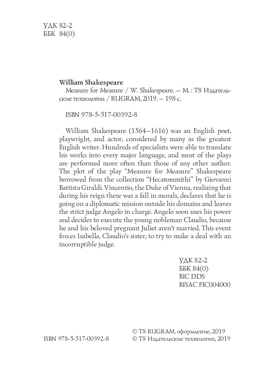 William Shakespeare (1564-1616) was an English poet, playwright, and actor, considered by many as the greatest English writer. Hundreds of specialists were able to translate his works into every major language, and most of the plays are performed more often than those of any other author. The plot of the play "Measure for Measure" Shakespeare borrowed from the collection "Hecatommithi" by Giovanni Battista Giraldi. Vincentio, the Duke of Vienna, realizing that during his reign there was a fall in morals, declares that he is going on a diplomatic mission outside his domains and leaves the strict judge Angelo in charge. Angelo soon uses his power and decides to execute the young nobleman Claudio, because he and his beloved pregnant Juliet aren't married. This event forces Isabella, Claudio's sister, to try to make a deal with an incorruptible judge.| Издательство | Т8 RUGRAM |