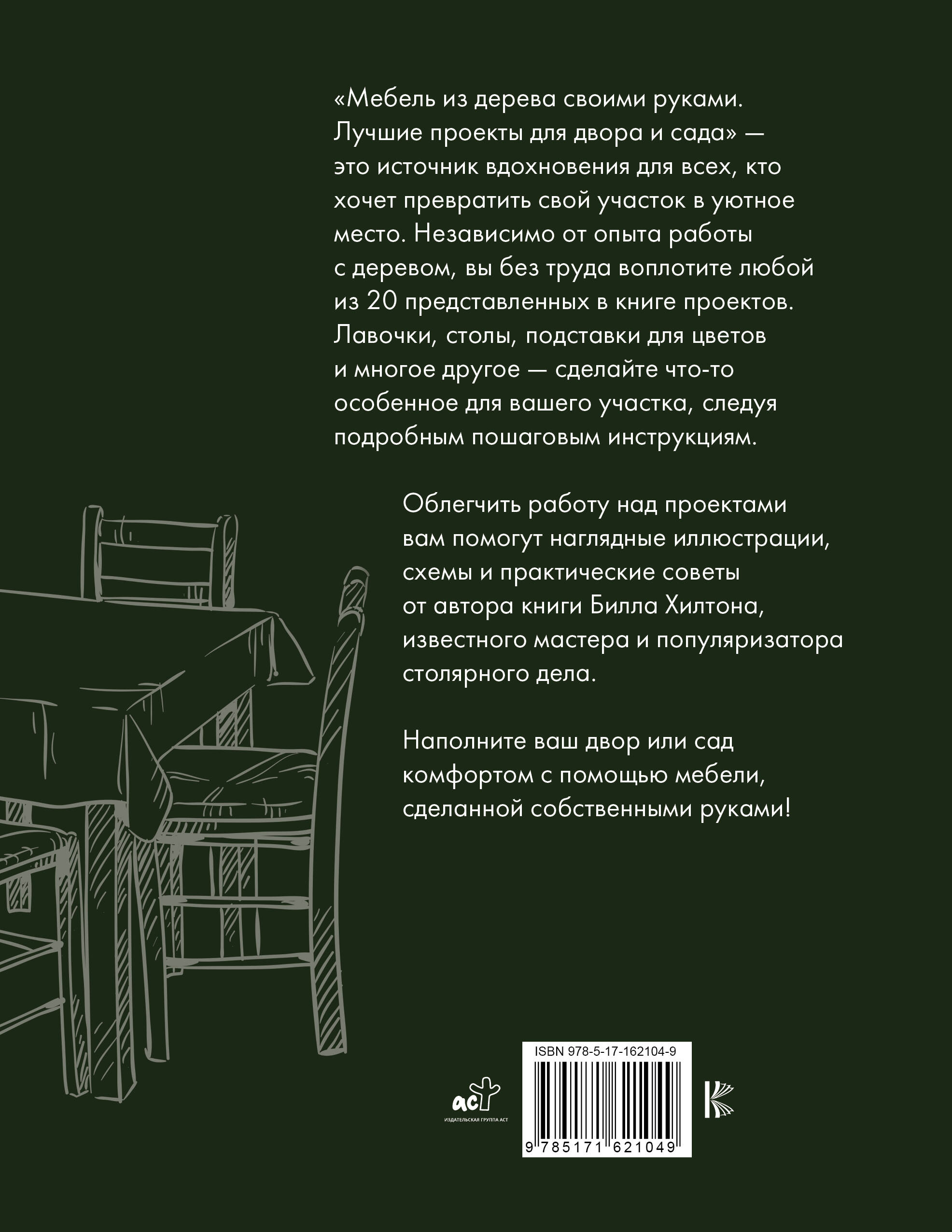 «Мебель из дерева своими руками. Лучшие проекты для двора и сада» - это источник вдохновения для всех, кто хочет превратить свой участок в уютное место. Независимо от опыта работы с деревом, вы без труда воплотите любой из 20 представленных в книге проектов. Лавочки, столы, подставки для цветов и многое другое - сделайте что-то особенное для вашего участка, следуя подробным пошаговым инструкциям. Облегчить работу над проектами вам помогут наглядные иллюстрации, схемы и практические советы от автора книги Билла Хилтона, известного мастера и популяризатора столярного дела. Наполните ваш двор или сад комфортом с помощью мебели, сделанной собственными руками!| Издательство | Издательство "АСТ" |