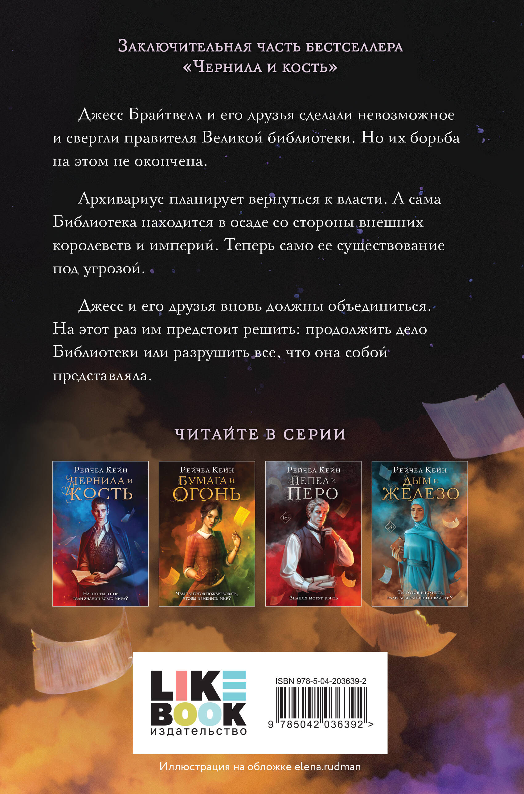 БЕСТСЕЛЛЕР THE NEW YORK TIMES. Заключительная книга популярной на весь мир серии «Великая библиотека» Рейчел Кейн. Продолжение романов «Чернила и кость», «Бумага и огонь», «Пепел и перо» и «Дым и железо». Джесс Брайтвелл и его друзья сделали невозможное и свергли правителя Великой библиотеки. Но их борьба на этом не окончена. Архивариус планирует вернуться к власти. А сама Библиотека находится в осаде со стороны внешних королевств и империй. Теперь само ее существование под угрозой. Джесс и его друзья вновь должны объединиться. На этот раз им предстоит решить: продолжить дело Библиотеки или разрушить все, что она собой представляла. «Захватывающее приключение… в котором сочетаются радости и горести "Голодных игр", а также психологические элементы из "Гарри Поттера"». - Booklist «Это захватывающее приключение с быстро развивающимся сюжетом от талантливой Кейн придется по вкусу всем фанатам фэнтези». - Library Journal Об авторе Рейчел Кейн - американская писательница, автор бестселлеров по версии New York Times, USA Today, а также международных бестселлеров. Она написала более сорока книг, включая роман «Принц теней», серии «Повелители стихий», «Сезон отверженных», «Возрожденец» и «Морганвилльские вампиры».| Издательство | ООО "Издательство "Эксмо" |