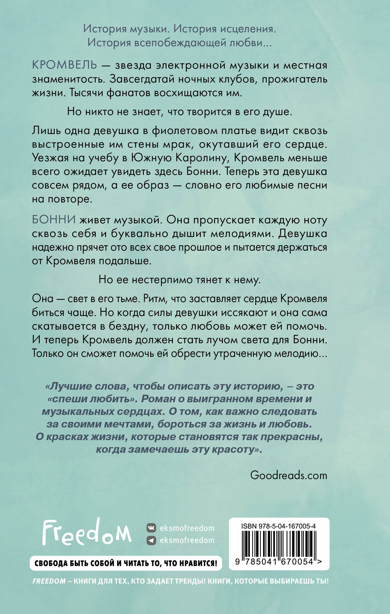 Кромвель - звезда электронной музыки, местная знаменитость. Завсегдатай ночных клубов и вечеринок, прожигатель жизни. Тысячи фанатов восхищаются им. Но никто не знает, что творится в его душе. Все меняется, когда Кромвель встречает девушку в фиолетовом платье, которая не похожа на остальных. Она видит сквозь выстроенные им стены мрак, окутавший его сердце. Уезжая на учебу из серой Англии в Южную Каролину, Кромвель меньше всего ожидает увидеть здесь Бонни. Вот только от судьбы не уйти: теперь эта девушка совсем рядом, а ее образ - словно его любимые песни, на повторе. Бонни живет музыкой. Она пропускает каждую ноту сквозь себя и буквально дышит мелодиями. Девушка надежно прячет ото всех свое прошлое и пытается держаться от Кромвеля подальше. Но ее нестерпимо тянет к нему. Она - свет в его тьме. Ритм, что заставляет сердце Кромвеля биться чаще. Но когда силы девушки иссякают и она сама скатывается в бездну, только любовь может ей помочь. И теперь Кромвель должен стать лучом света для Бонни. Только он сможет помочь ей обрести утраченную мелодию… «Мечта для нас» - это второй роман Тилли Коул, который вышел в России и мгновенно стал бестселлером. Мы дарим роману второе дыхание, выпуская его в новом оформлении, в эстетике книг цикла «Братья Карилло», чтобы вы могли собрать на полке всю серию в едином стиле! Было продано почти 30 тыс. экземпляров романа в нашей стране! Читатели мгновенно влюбились в трогательную красоту этой искренней истории о музыканте, потерявшем вкус к творчеству и девушке, подарившей ему свет, но неумолимо погружающейся в бездну тьмы. Кромвель - музыкант. Он был рожден для создания классики, но вдохновение покинуло его. У парня так называемый цветной слух: ритмы и мелодии он видит в цвете. И лишь электронная музыка с недавних пор не причиняет ему боль. Бонни тоже пытается писать музыку, но ее силы тают с каждым днем. Она подарит ему веру в себя. Он станет ее светом. Но успеют ли они воплотить в жизнь свою главную симфонию, когда времени остается так мало? «Тилли создала сокровенную историю, глубоко личную для каждого из нас, историю потерь, вины, любви и всего того, что таится между ними. От первой до последний страницы этот роман - совершенная литературная симфония, которая сливается с мелодией вашего сердца и не утихает до финального аккорда». - Amazon.com «Музыка дает душу вселенной, крылья разуму, полет воображению и жизнь всему», - так сказал великий Платон. В этом романе Тилли Коул подтверждает: все неуловимое и нематериальное имеет наивысшую силу для раненого сердца. Музыка и любовь способны спасти нашу жизнь. Обложки этой серии - летние, яркие, словно зефирки. Так считают читательницы. И они непременно станут украшением на любой полке!| Издательство | Эксмо |