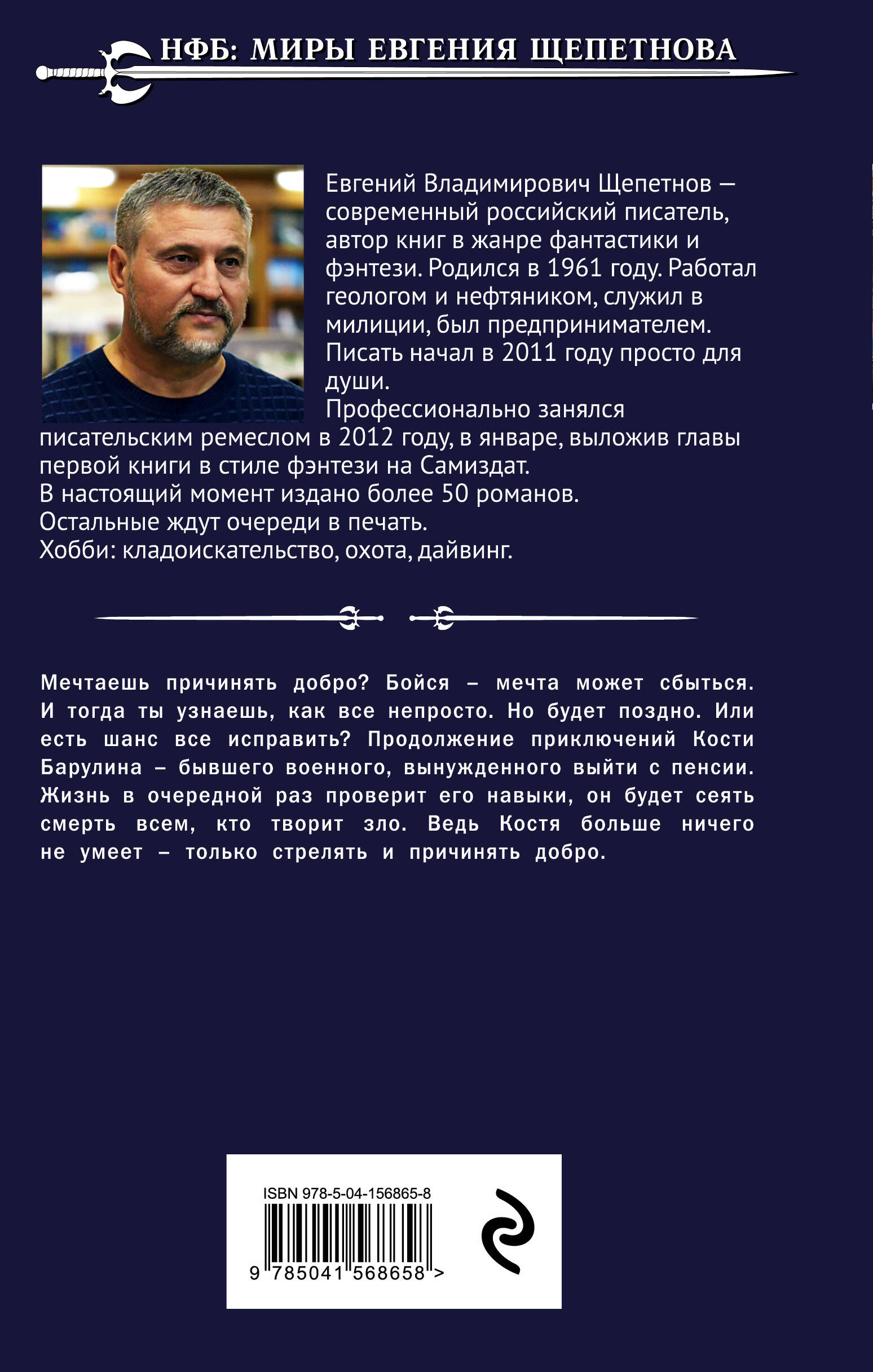 Евгений Щепетнов - бывший офицер милиции, инженер-геолог, путешественник и искатель приключений. Обладает уникальным житейским опытом, который помогает писать романы в популярных жанрах: фэнтези и попаданцев в другие миры. Мечтаешь причинять добро? Бойся - мечта может сбыться. И тогда ты узнаешь, как все непросто. Но будет поздно. Или есть шанс все исправить? Продолжение приключений Кости Барулина - бывшего военного, вынужденного выйти с пенсии. Жизнь в очередной раз проверит его навыки, он будет сеять смерть всем, кто творит зло. Ведь Костя больше ничего не умеет - только стрелять и причинять добро.| Издательство | ООО "Издательство "Эксмо" |