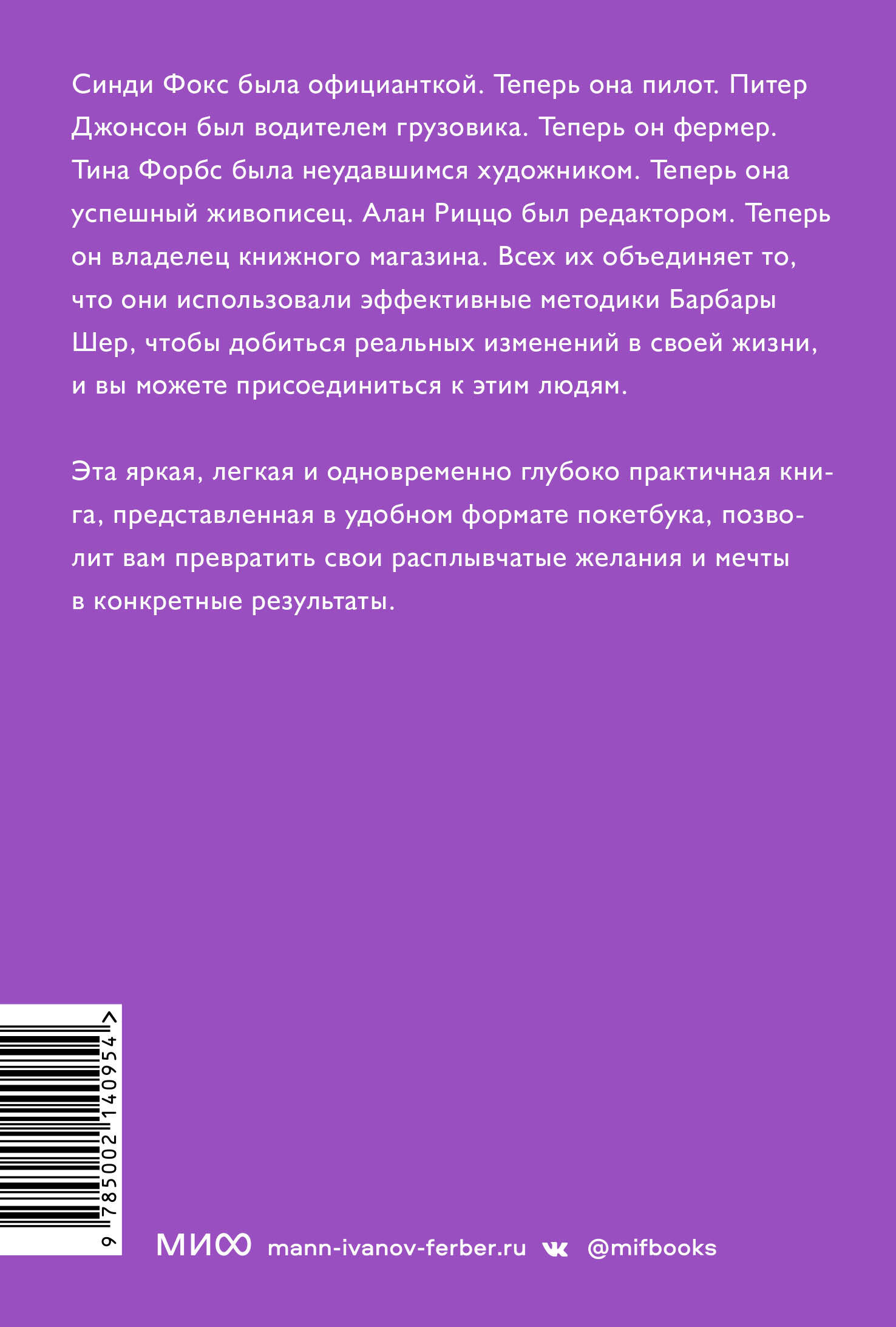 Легендарная книга Барбары Шер о том, как реализовать себя в жизни, вышла в новом формате покетбука. Ее удобно положить в сумку, читать в дороге или на пляже, она может занять достойное место в домашней библиотеке. А еще поможет прислушаться к себе и своим мечтам, научиться получать удовольствие от жизни и добиваться поставленных целей. Синди Фокс была официанткой. Теперь она пилот. Питер Джонсон был водителем грузовика. Теперь он фермер. Алан Риццо был редактором. Теперь он владелец книжного магазина. Что отличает этих людей от остальных? Все они использовали эффективные методики Барбары Шер для того, чтобы добиться реальных изменений в своей жизни. Эта человечная, глубоко практичная книга позволит каждому превратить свои расплывчатые желания и мечты в конкретные результаты. Прочитав ее, вы узнаете: - как обнаружить свои сильные стороны и скрытые таланты; - как обратить страхи и негативные эмоции себе на пользу; - как наметить путь к цели и обозначить сроки ее достижения; - как отслеживать прогресс ежедневно; - как создать сеть полезных контактов и источников информации; - как использовать группу поддержки, которая поможет не отклоняться цели. Для кого эта книга: Для тех, кто хочет претворить свои мечты в жизнь.| Издательство | МАНН, ИВАНОВ И ФЕРБЕР ООО |