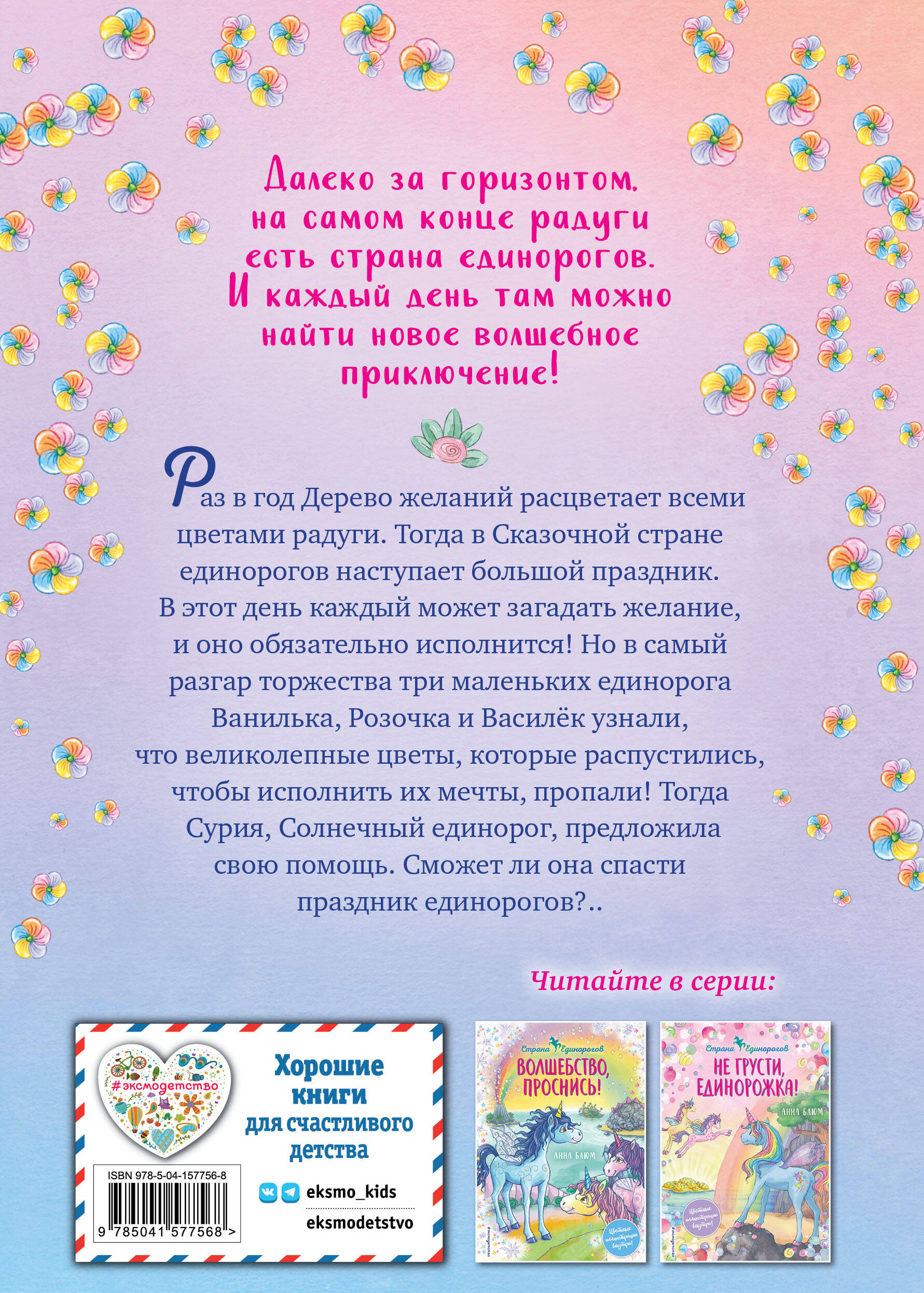 «Что бы такого пожелать?» - взволнованно перешептываются маленькие единорожки. В скором времени Дерево желаний расцветёт пёстрыми цветами, и состоится большой праздник. В этот день каждый житель Сказочной страны единорогов сможет доверить Дереву своё самое заветное желание! Но когда праздник приближается к кульминации, Ванилька, Розочка и Василёк обнаруживают, что цветы, которые должны исполнить их мечты, исчезли! Единороги невероятно популярные животные! Это добрые и утончённые создания, которые умеют творить чудеса и очень нравятся современным детям. История поможет ребёнку поверить в себя и взглянуть на мир иначе. Расскажет простым языком о том, почему иногда портится настроение, почему жадиной быть нехорошо и о многом другом. Книгу удобно держать в детских руках, она небольшого формата. Внутри цветные иллюстрации, крупный шрифт и простой текст, который ребёнок сможет прочитать сам, без помощи взрослых.