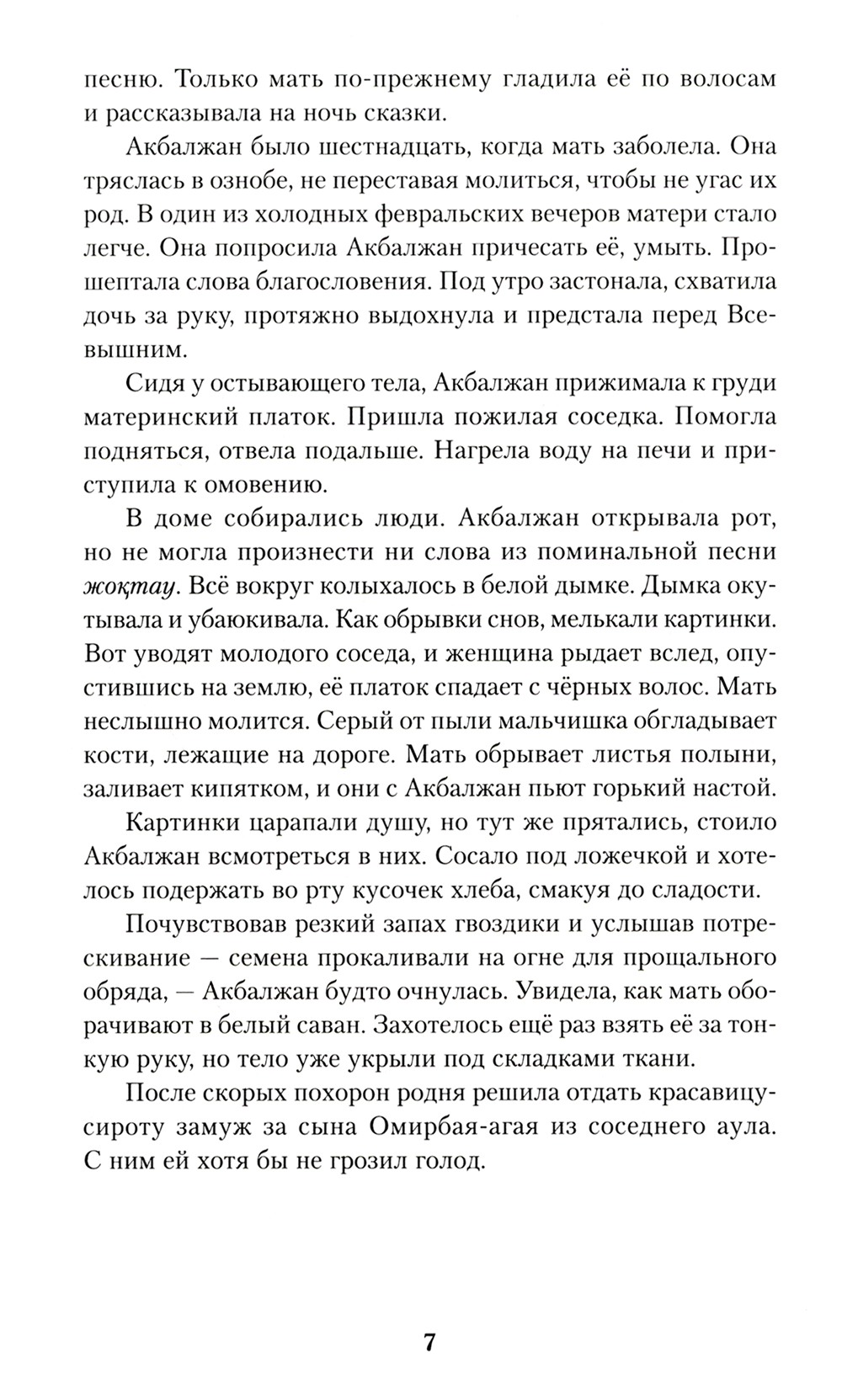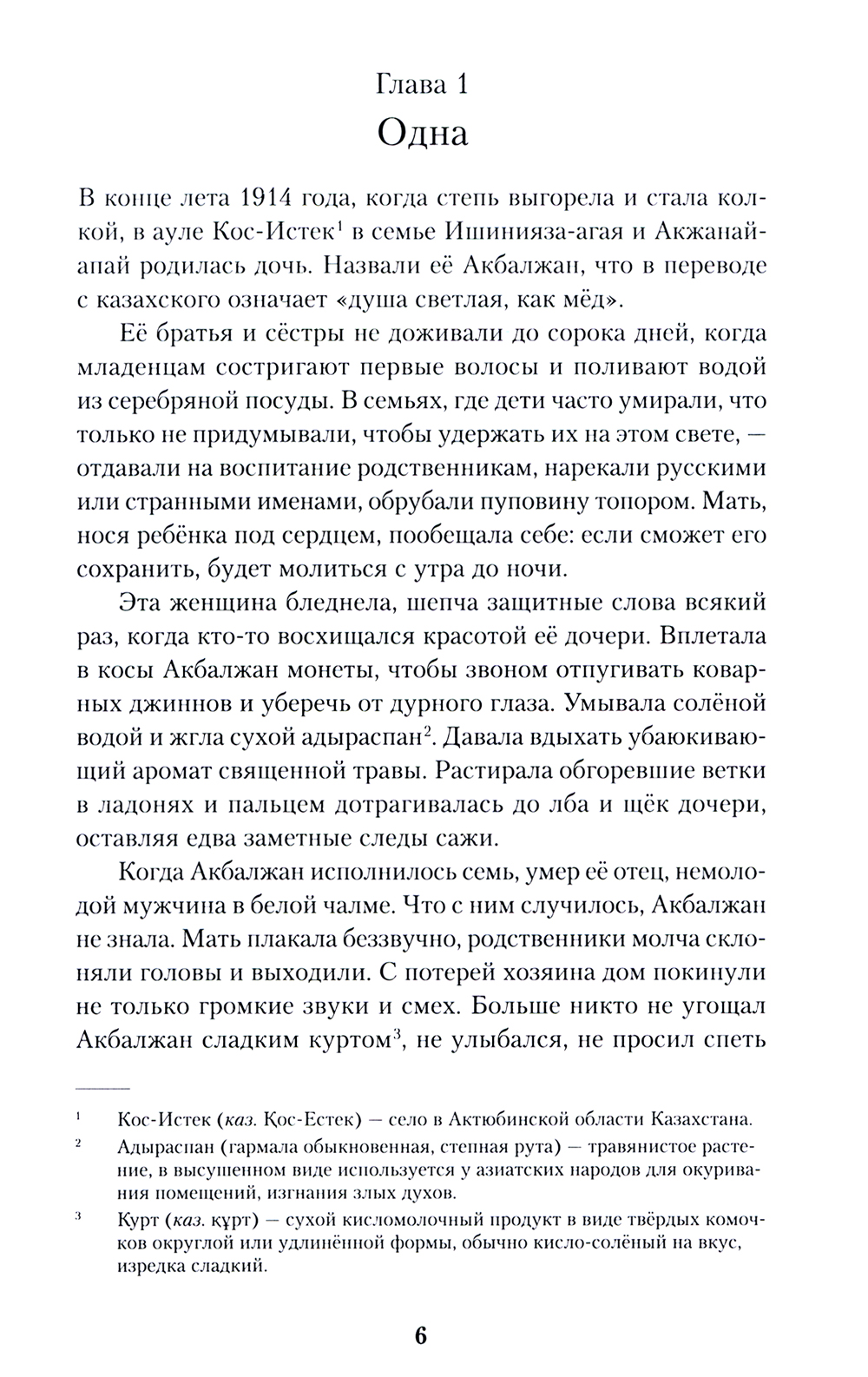 История одного казахского рода на протяжении века. Раскулачивание, война, перестроечные девяностые, личные потери и маленькие победы - глазами женщин трёх поколений. Старшую из них, Акбалжан, в шестнадцать лет выдали замуж, чтобы спасти от голода. Что заставило её бежать в неизвестность с двумя маленькими детьми? Найдёт ли она любовь и счастье? Сможет ли сохранить в чужой стране себя, родной язык, сказки и песни матери и передать их дочерям? И какая сила шестьдесят лет спустя потянет её внучку на родину предков? Основано на реальных событиях, имеются элементы художественного вымысла.| Издательство | Zerde Publishing |