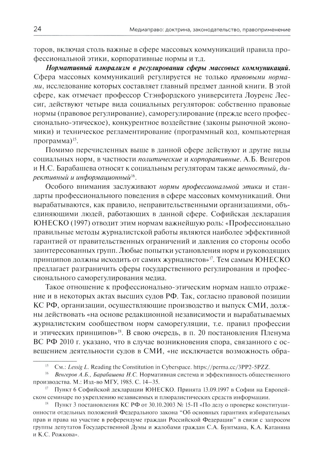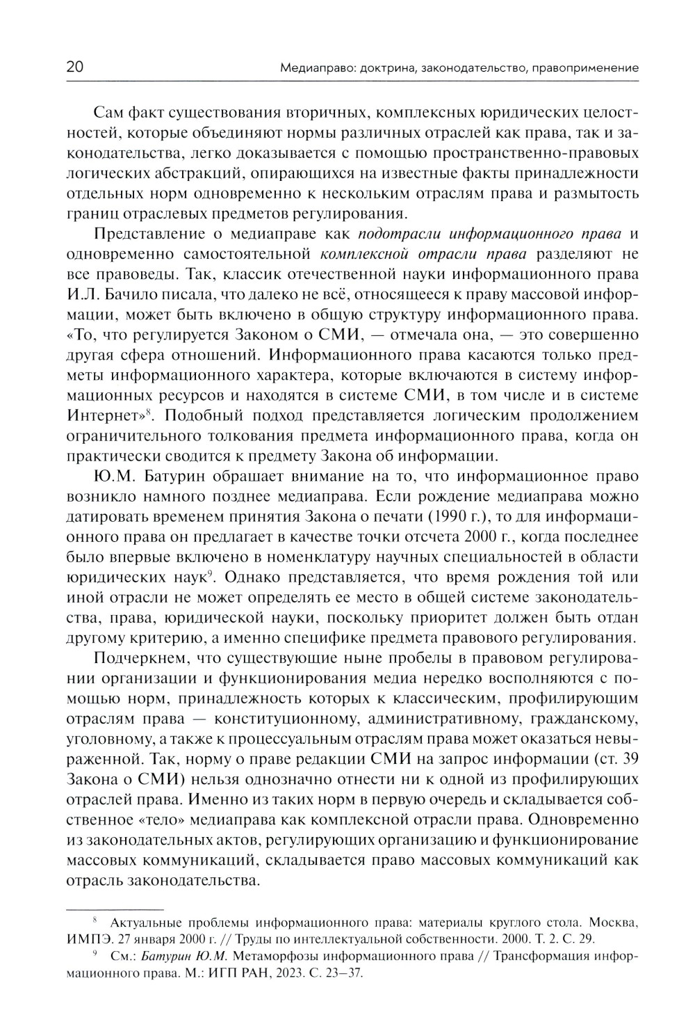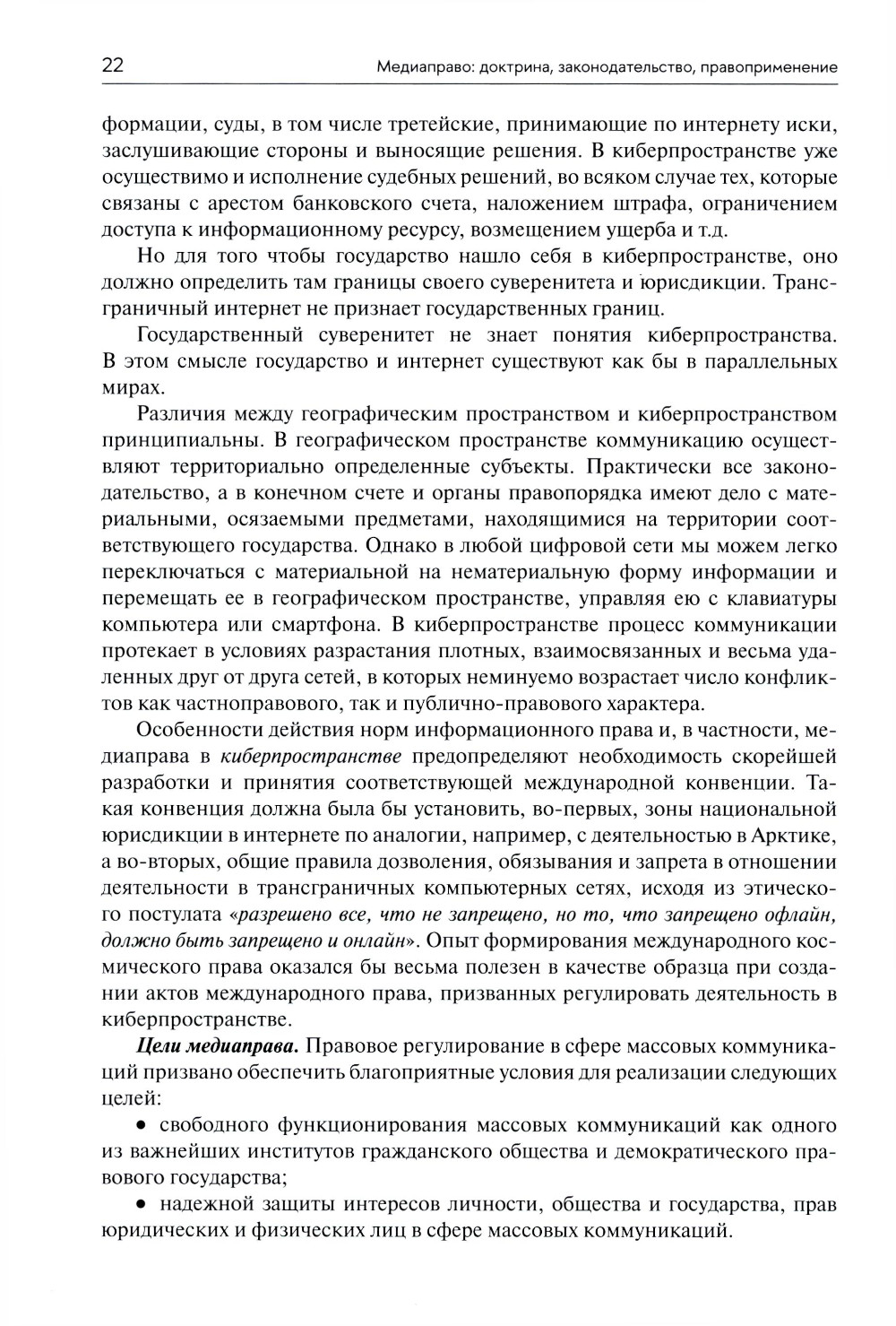 В книге раскрываются основные понятия и институты, образующие современную доктрину медиаправа как права массовых коммуникаций. Освещаются нормативные основы правового регулирования общественных отношений, связанных с организацией и функционированием медиа, деятельностью учредителей и редакций СМИ, теле- и радиовещателей, журналистов, блогеров и др. Рассматривается правоприменительная практика по делам, связанным с применением законодательства о массовых коммуникациях. Учебник соответствует ФГОС ВО последнего поколения. Для студентов, аспирантов и преподавателей юридических вузов, а также факультетов права, журналистики, массовых коммуникаций, информационной безопасности, слушателей системы повышения квалификации, практических работников и всех интересующихся вопросами правового регулирования медийной инфраструктуры современного общества.| Издательство | ИД Высшей школы экономики |