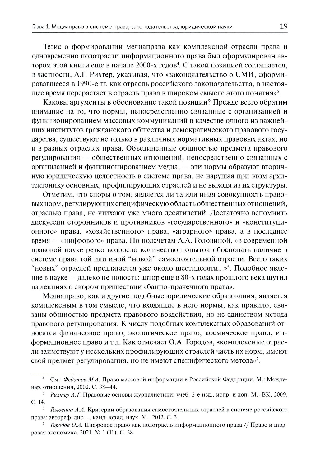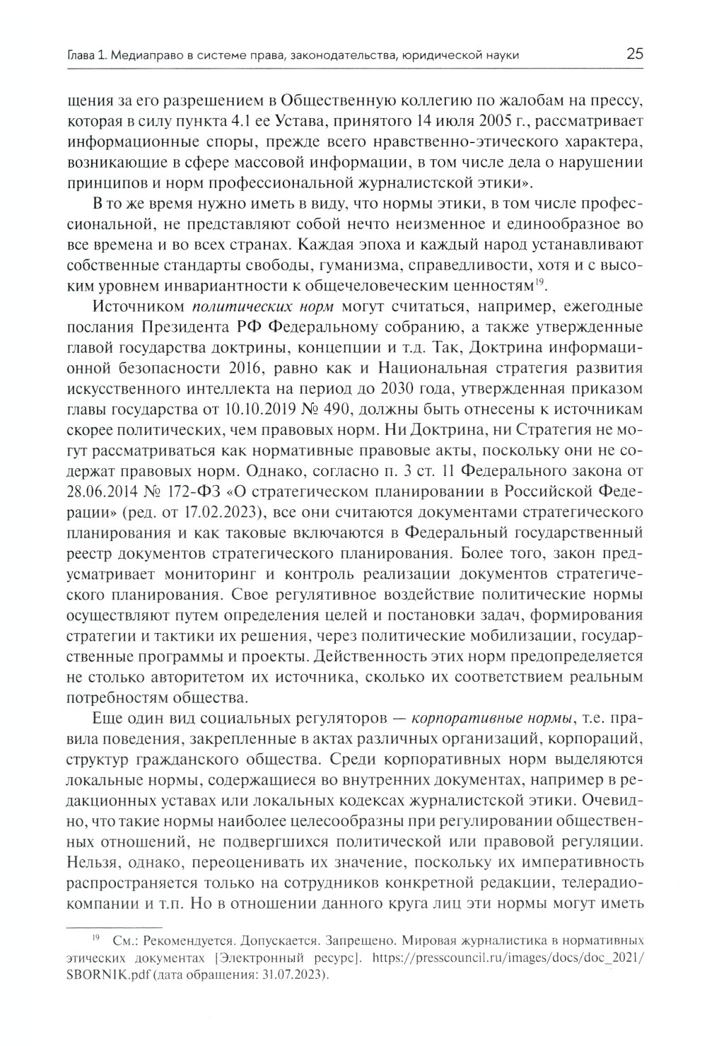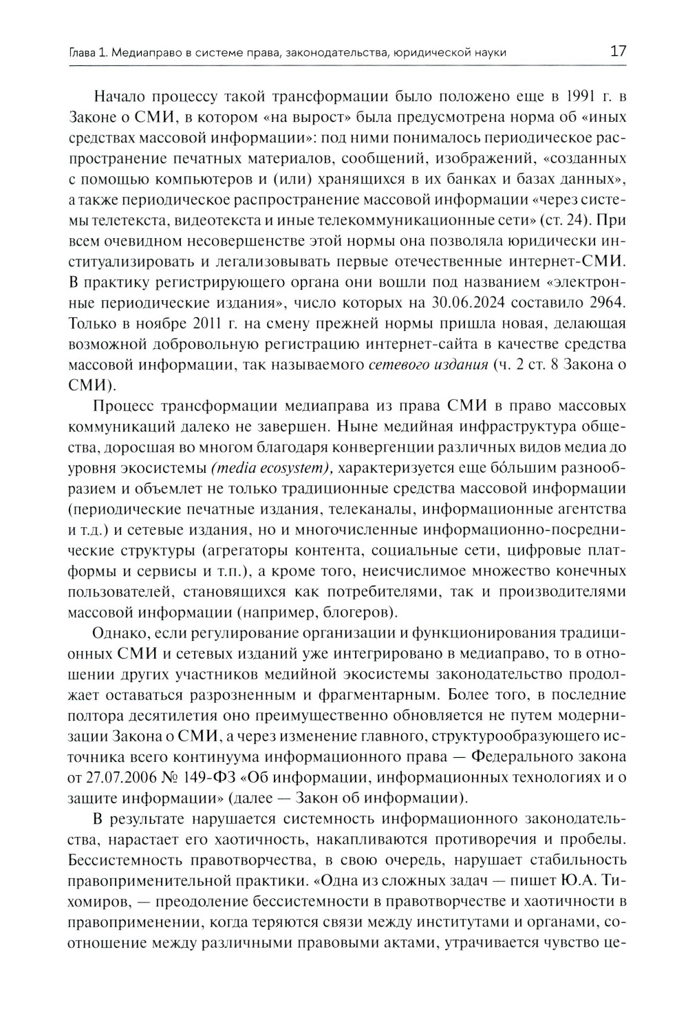 В книге раскрываются основные понятия и институты, образующие современную доктрину медиаправа как права массовых коммуникаций. Освещаются нормативные основы правового регулирования общественных отношений, связанных с организацией и функционированием медиа, деятельностью учредителей и редакций СМИ, теле- и радиовещателей, журналистов, блогеров и др. Рассматривается правоприменительная практика по делам, связанным с применением законодательства о массовых коммуникациях. Учебник соответствует ФГОС ВО последнего поколения. Для студентов, аспирантов и преподавателей юридических вузов, а также факультетов права, журналистики, массовых коммуникаций, информационной безопасности, слушателей системы повышения квалификации, практических работников и всех интересующихся вопросами правового регулирования медийной инфраструктуры современного общества.| Издательство | ИД Высшей школы экономики |