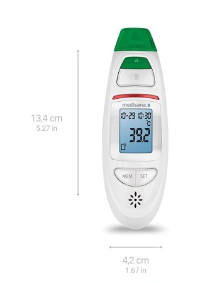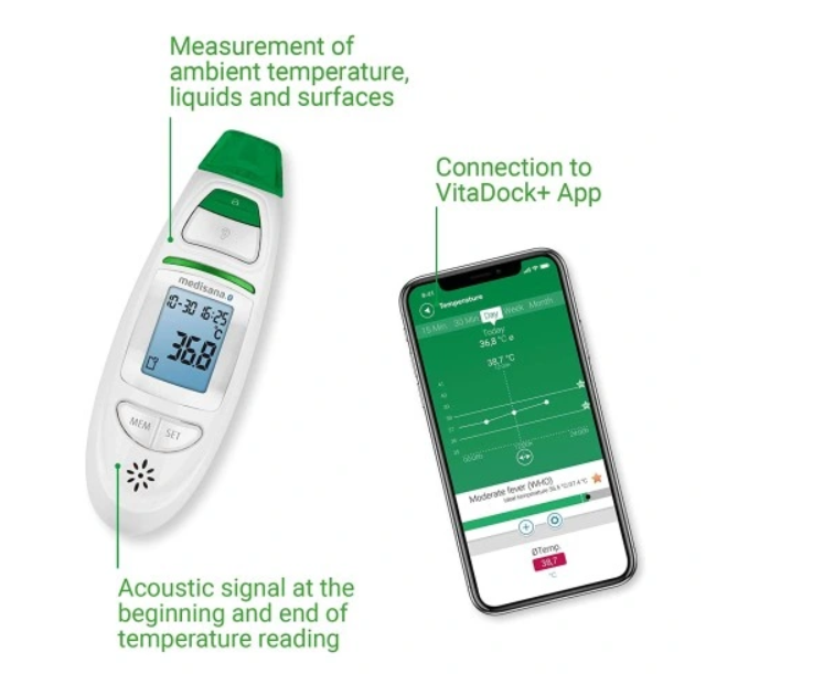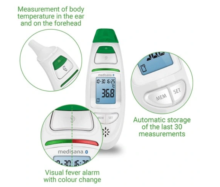 С помощью инфракрасного термометра TM 750 Connect от Medisana вы можете точно измерить температуру тела на лбу или в ухе. Многофункциональный термометр подает звуковой сигнал, когда он готов к измерению и когда измерение завершено.
