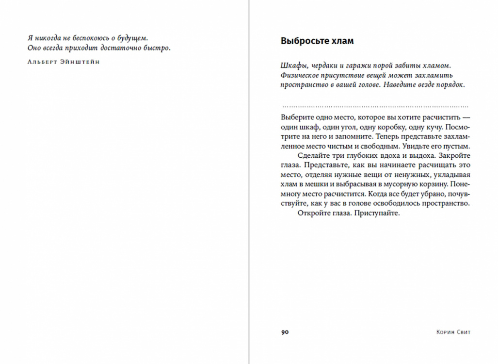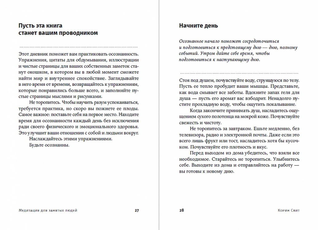 Мы торопимся успеть все больше и не замечаем, как проходит жизнь. Мы не получаем удовольствия от общения, не замечаем вкуса еды, не видим красоту распустившегося цветка. Зато мы устаем, нервничаем, переживаем. Хочется снизить обороты, расслабиться, сделать паузу. Но на это опять нет времени. На самом деле для полноценного отдыха не обязательно тратить по два часа в день на медитацию в тишине. Надо просто стать осознаннее, научиться жить в настоящем. В книге "Медитация для занятых людей" Корин Свит дает упражнения на осознанность, которые можно легко выполнять за рабочим столом, в переполненном вагоне метро или в очереди в магазине.| Издательство | Альпина |
