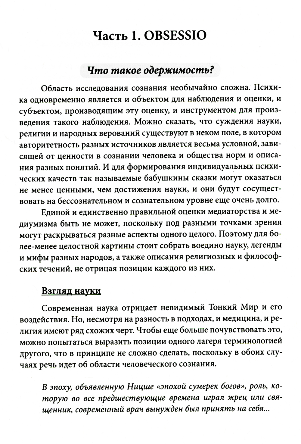 Цель этой книги - изучить разновидности одержимости, научиться определять присутствие (или отсутствие) чужеродных сущностей в человеке, а также найти методы избавления от них. Одновременно преследовалась и другая цель - показать, что наличие деструктивных сил не должно стать препятствием для духовного роста. Зная, что и как омрачает сознание, можно найти и то, что его очищает, возвышает и утончает. В этом плане исследование одержимости скорее будет промежуточным звеном, пройдя которое, люди откроют для себя новые горизонты развития. Книга рассчитана на широкий круг читателей, и написана так, чтобы создать логичную схему и дать общее определение одержимости в простой форме, доступной для понимания обычного человека, и в то же время удовлетворяющей своей полнотой специалистов, которые изучают философию, психологию, и в особенности медицинских работников.