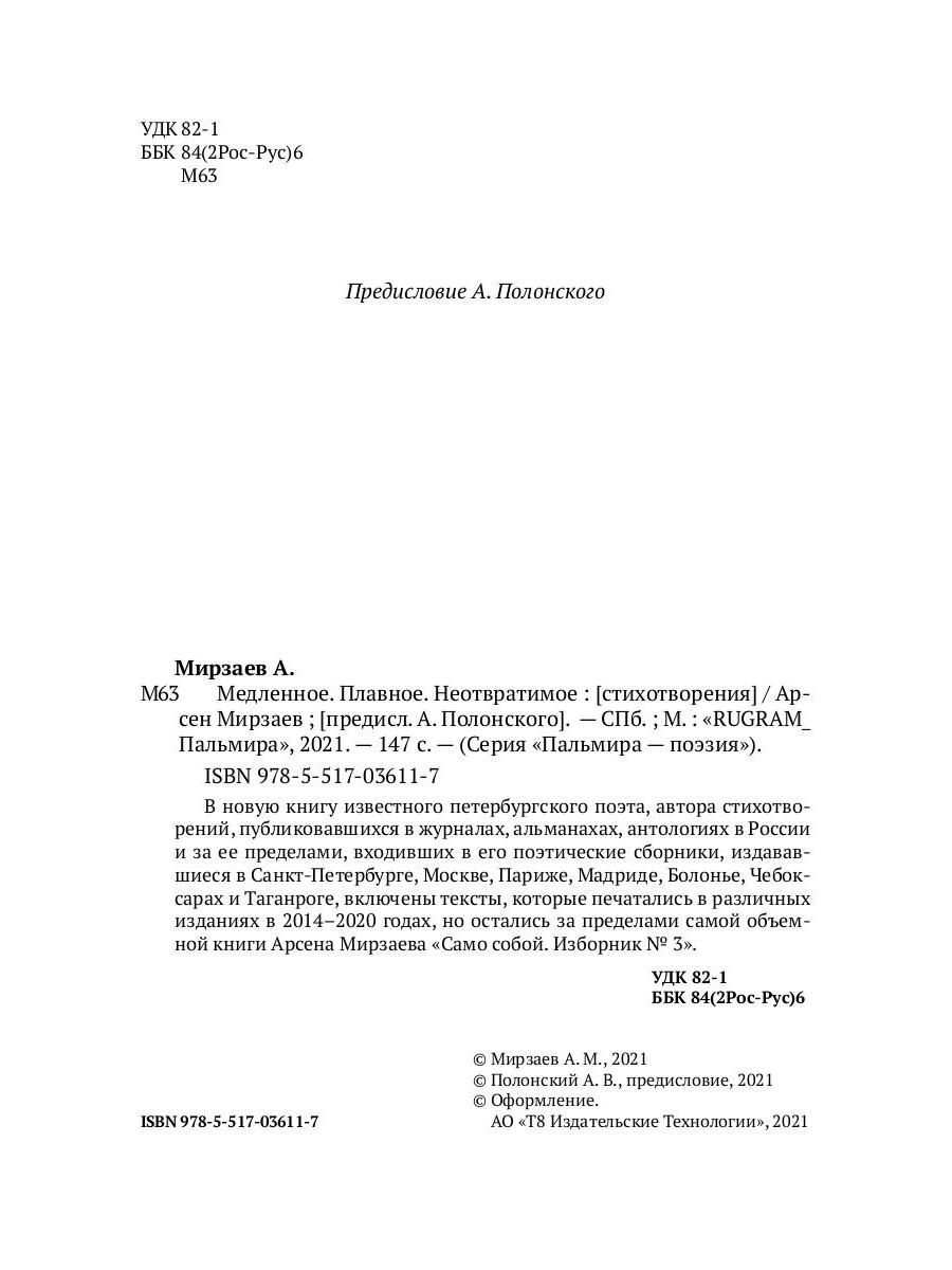 В новую книгу известного петербургского поэта, автора стихотворений, публиковавшихся в журналах, альманахах, антологиях в России и за ее пределами, входивших в его поэтические сборники, издававшиеся в Санкт-Петербурге, Москве, Париже, Мадриде, Болонье, Чебоксарах и Таганроге, включены тексты, которые печатались в различных изданиях в 2014-2020 годах, но остались за пределами самой объемной книги Арсена Мирзаева «Само собой. Изборник № 3».