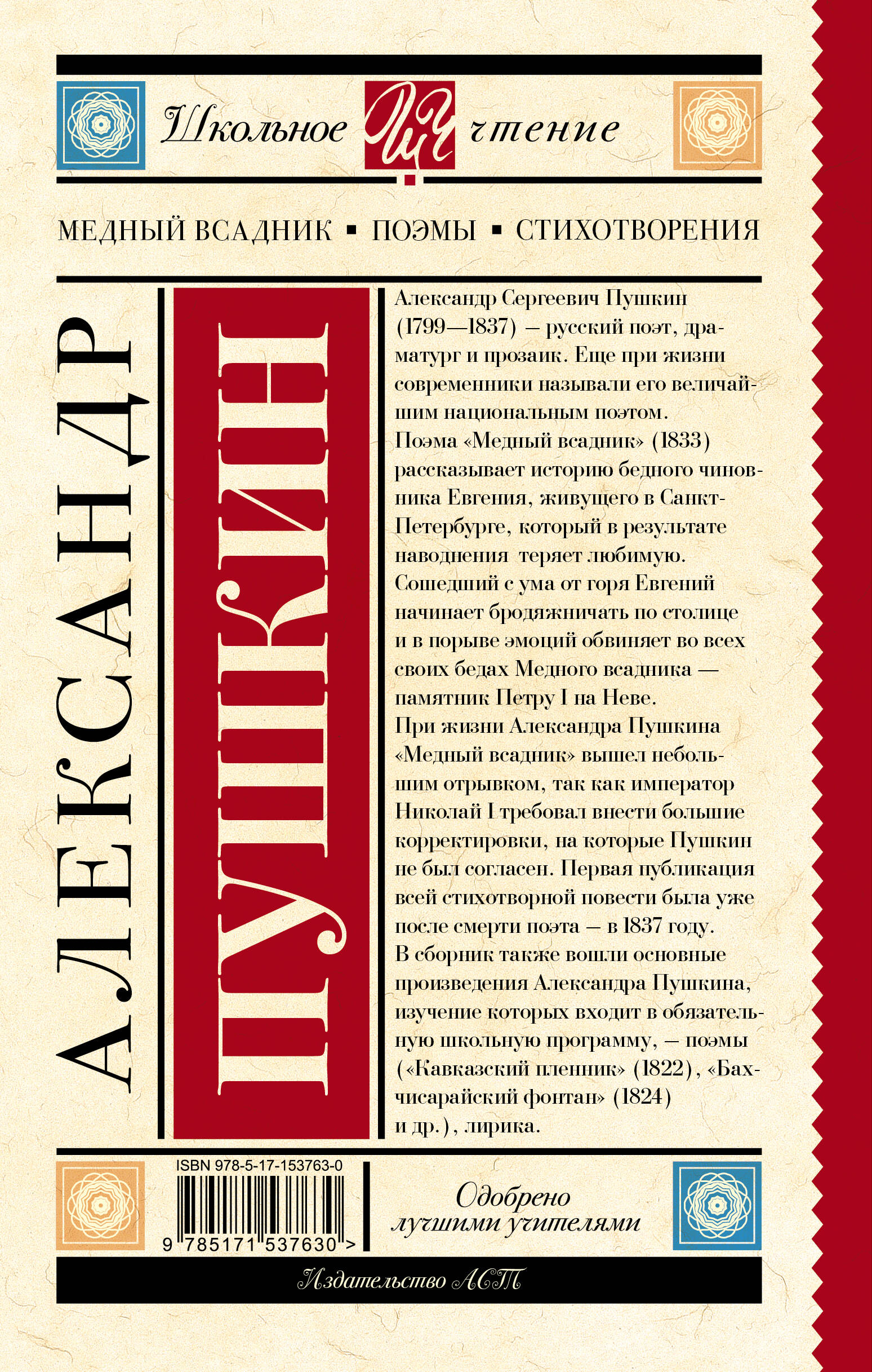 Александр Сергеевич Пушкин (1799-1837) - русский поэт,драматург и прозаик. Еще при жизни современники называли его величайшим национальным поэтом. Поэма "Медный всадник" (1833) рассказывает историю бедного чиновника Евгения, живущего в Санкт-Петербурге, который в результате наводнения теряет любимую. Сошедший с ума от горя Евгений начинает бродяжничать по столице и в порыве эмоций обвиняет во всех своих бедах Медного всадника - памятник Петру I на Неве. При жизни Александра Пушкина "Медный всадник" вышел небольшим отрывком, так как император Николай I требовал внести большие корректировки, на которые Пушкин не был согласен. Первая публикация всей стихотворной повести была уже после смерти поэта - в 1837 году. В сборник также вошли основные произведения Александра Пушкина,изучение которых входит в обязательную школьную программу, - поэмы ("Кавказский пленник" (1822), "Бахчисарайский фонтан" (1824) и др.), лирика.