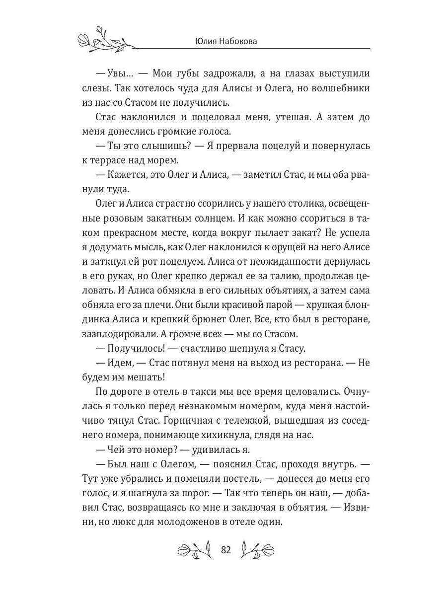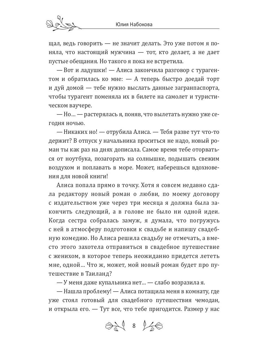 Медовый месяц в Таиланде - что может быть романтичнее? Так думала писательница любовных романов Настя, когда покупала путевку на остров Самуи в подарок на свадьбу сестры. Но свадьба в последний момент расстроилась. Не пропадать же путевке! Настя летит в Таиланд за вдохновением - для новой книги. Однако в люксе для молодоженов она оказывается не одна. Вместо жениха на отдых приехал его лучший друг. И он решительно настроен остаться в номере! Что же делать? Как избавиться от нежелательного соседа? У Насти есть план! И отступать она не намерена. В сборник рассказов Юлии Набоковой вошли короткие истории о любви, случайных встречах и неожиданных поворотах судеб, которые приведут к большому счастью.| Издательство | Т8 RUGRAM |