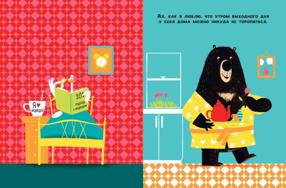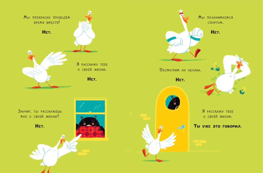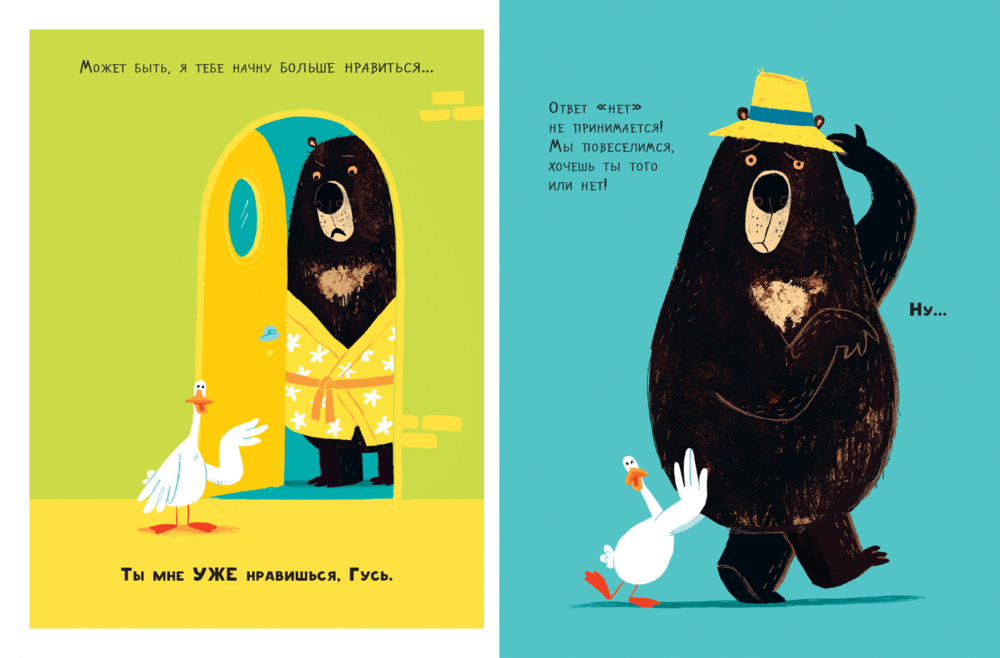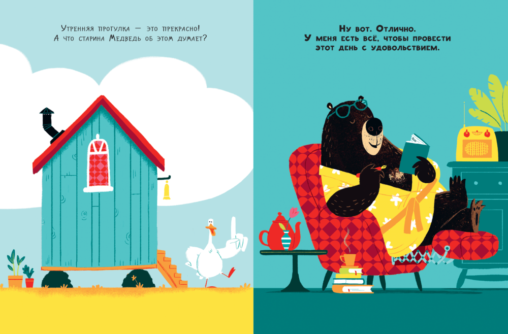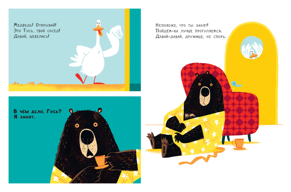 Медведь очень хочет провести выходной день дома в тишине. Он даже уже надел уютный халат и заварил себе чай. Но его друг Гусь, живущий по соседству, спланировал для них двоих весь день: они, конечно же, должны срочно отправиться на прогулку и рассказать друг другу о своей жизни. Или сделать вместе зарядку. Зачем? Чтобы понравиться друг другу еще больше.