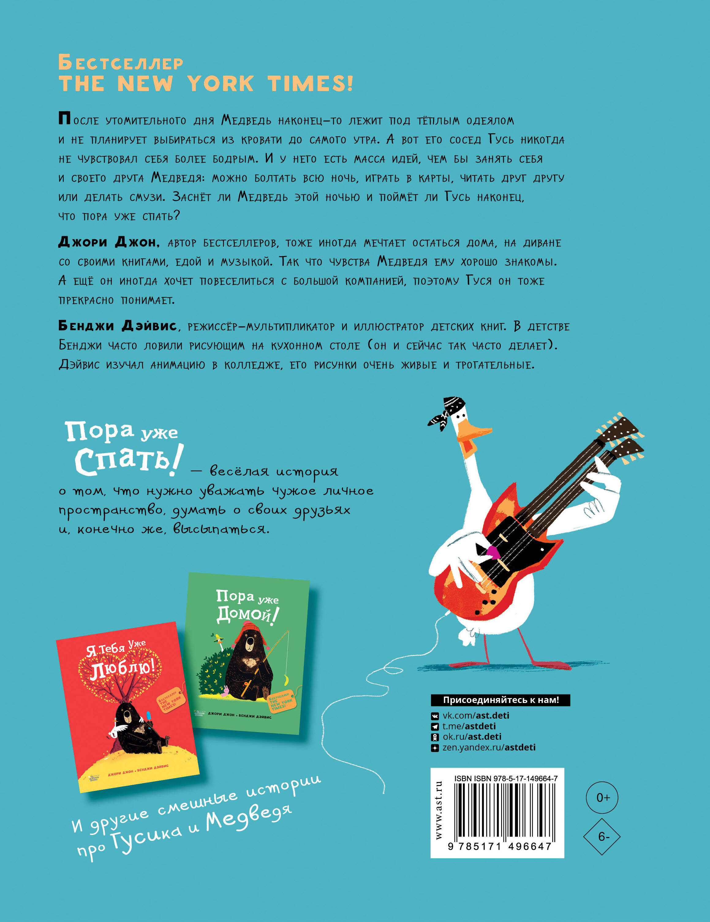 Бестселлер The New York Times! Обнимая своего плюшевого розового кролика, Медведь готовится сладко заснуть. Но у его назойливого соседа Гуся совсем другие планы на вечер: посмотреть кино, поиграть на гитаре, испечь печенье - и всё это, конечно, в компании своего друга Медведя. Удастся ли Медведю заснуть этой ночью и что ещё придумает этот неугомонный Гусь? Автор бестселлеров Джори Джон легко и с юмором рассказал детям об удивительной дружбе таких непохожих друг на друга друзей. А воплотить в жизнь эту весёлую историю ему помог обладатель международных премий иллюстратор Бенджи Дэйвис. Книга была удостоена почётной награды The E.B. White Read-Aloud Award в номинации "Picture book". "Пора уже спать!" - весёлая и такая правдоподобная история для детей и взрослых о том, как важно уважать чужое личное пространство, думать о своих друзьях и, конечно же, высыпаться. Для дошкольного и младшего школьного возраста.| Издательство | АСТ |