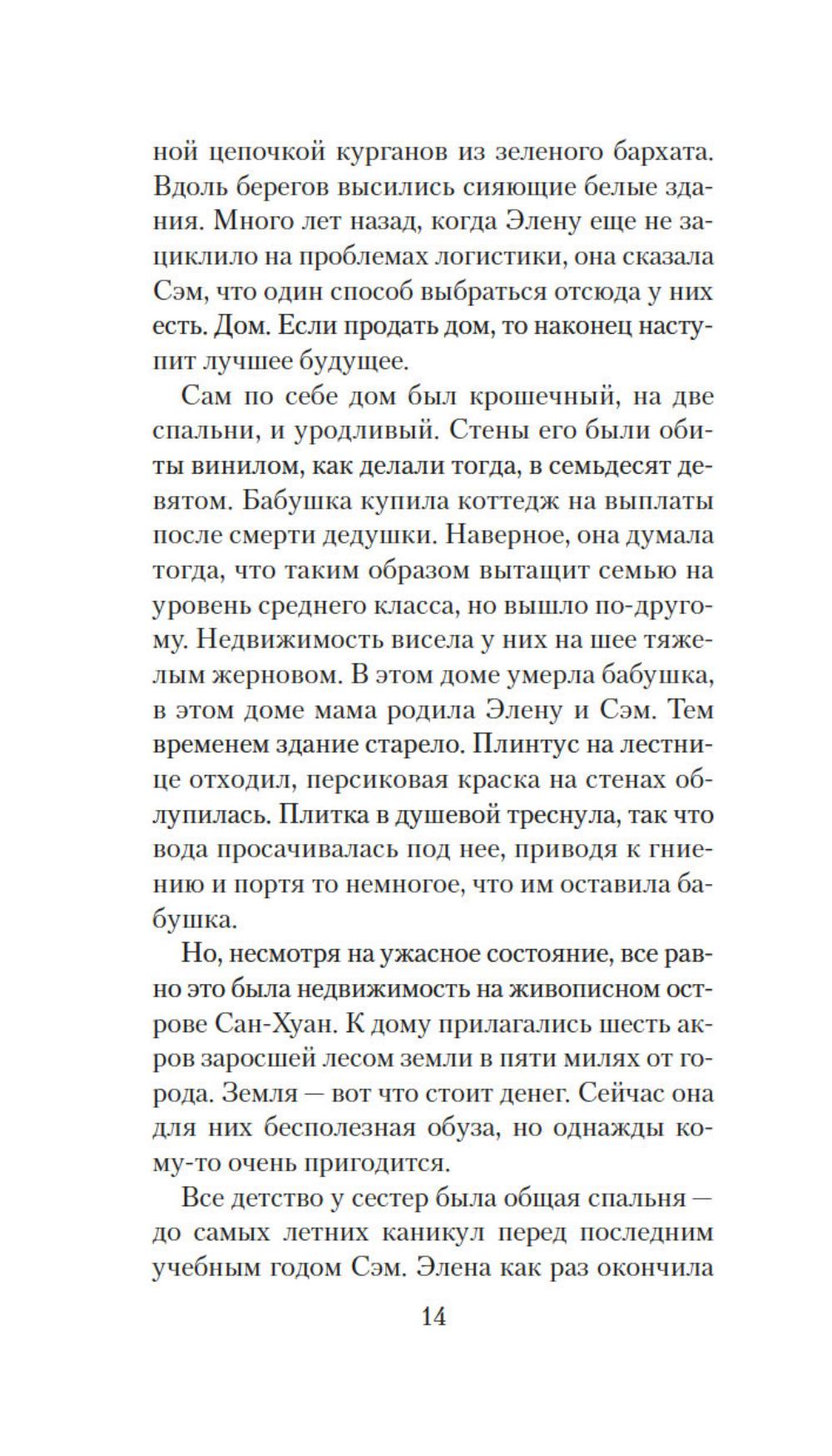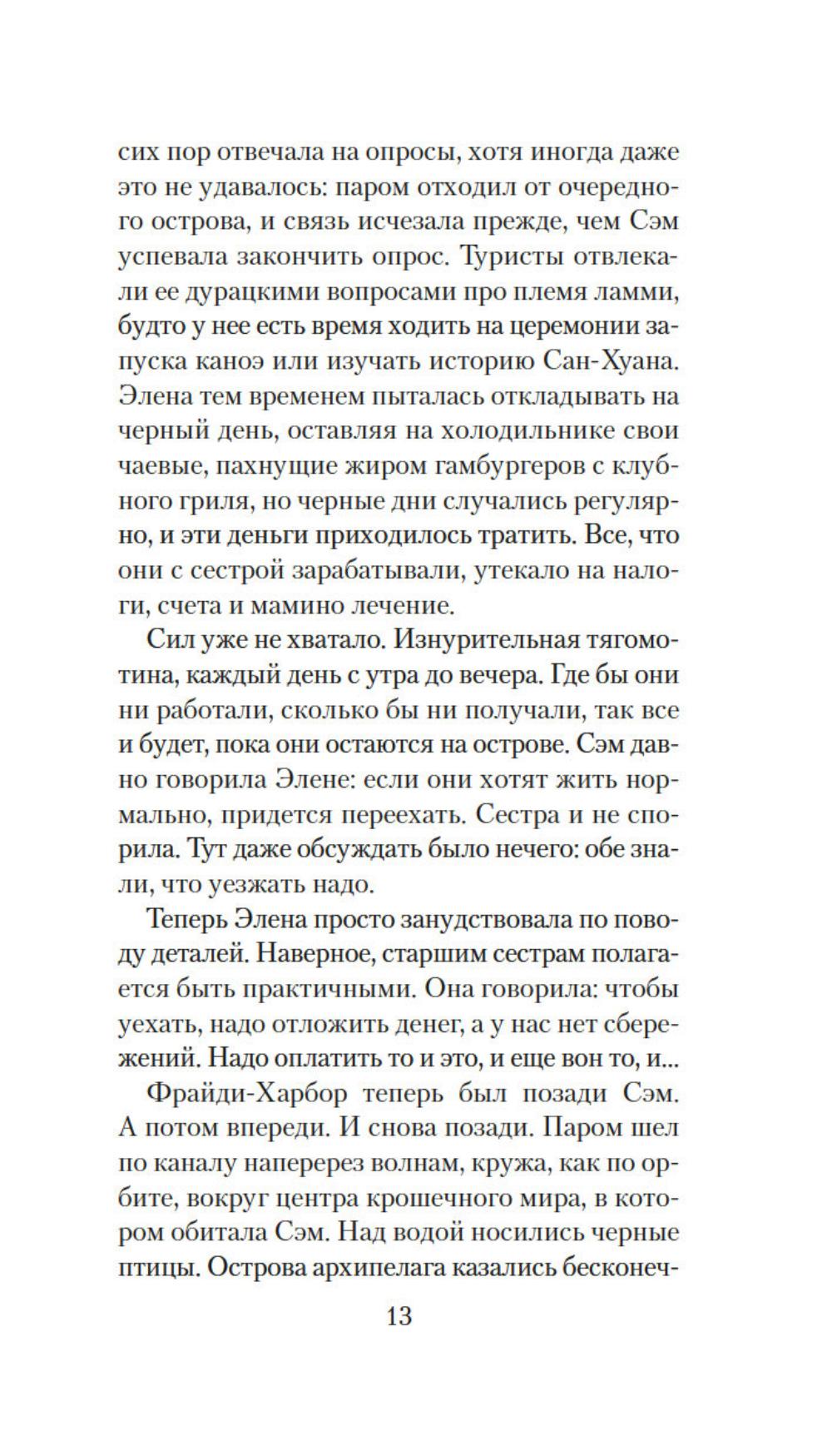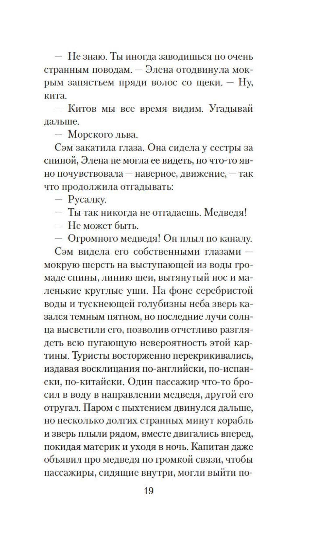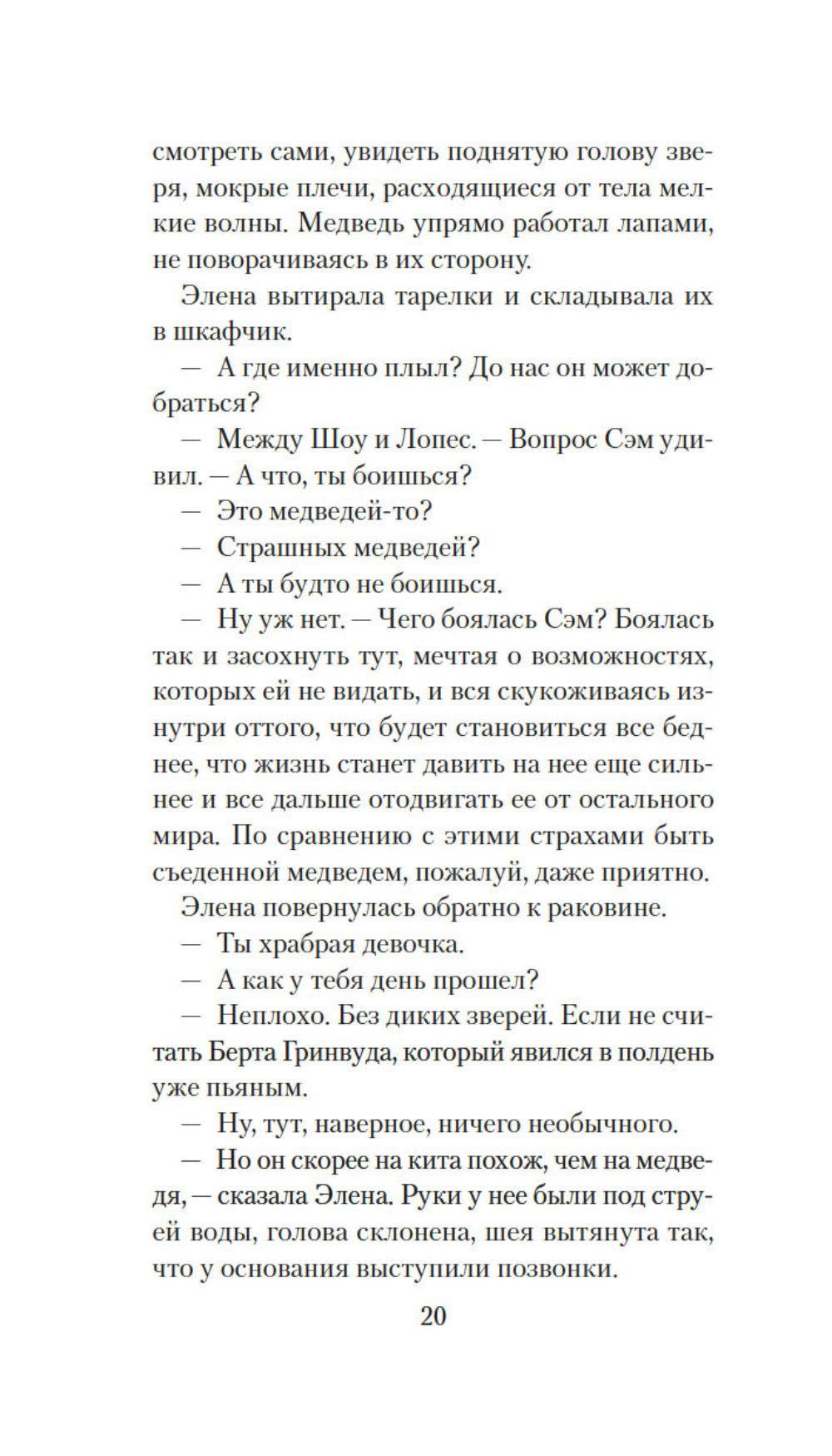 Сэм привыкла во всем слушаться сестру Элену, которая на год старше ее. В детстве родной остров Сан-Хуан казался девочкам волшебным царством, где можно целыми днями гулять по лесам, купаться в океане и проводить время за веселыми играми. Но по мере взросления жизнь поворачивается к сестрам своей жестокой реальностью: матери ставят смертельный диагноз, а работу не найти и денег вечно не хватает, да еще пандемия ковида наступает... И все же Сэм старается держаться, цепляясь за надежду преодолеть трудности и однажды вырваться в большой мир вместе с Эленой. Но на острове откуда ни возьмись появляется огромный дикий медведь - и мечты сестер оказываются под угрозой.| Издательство | Иностранка |
