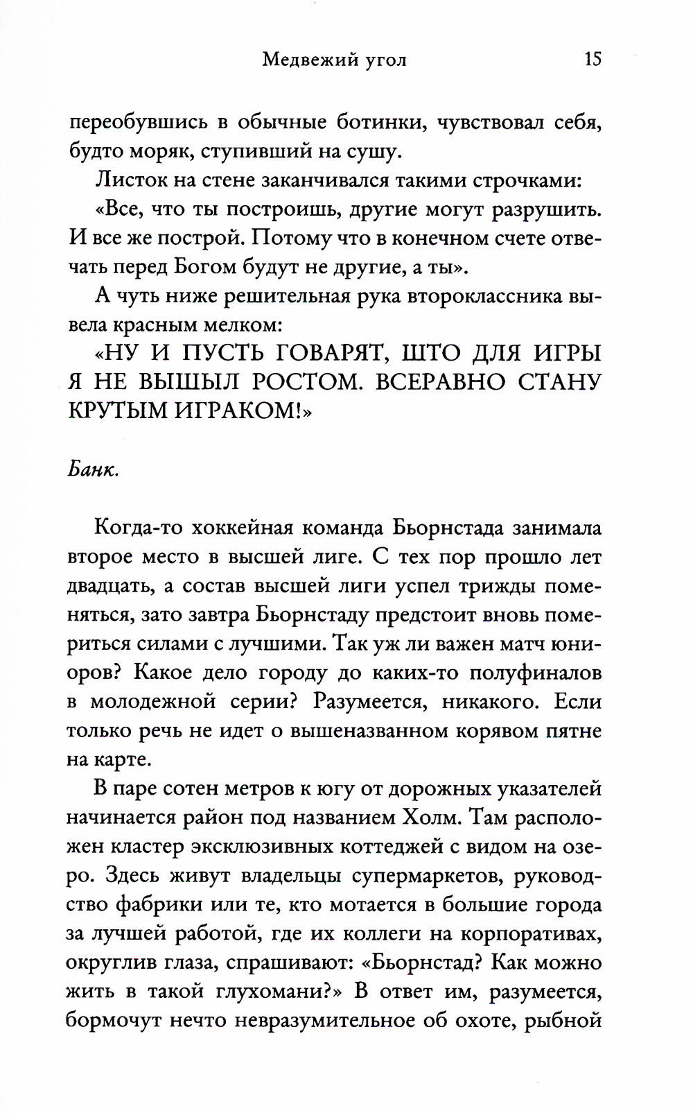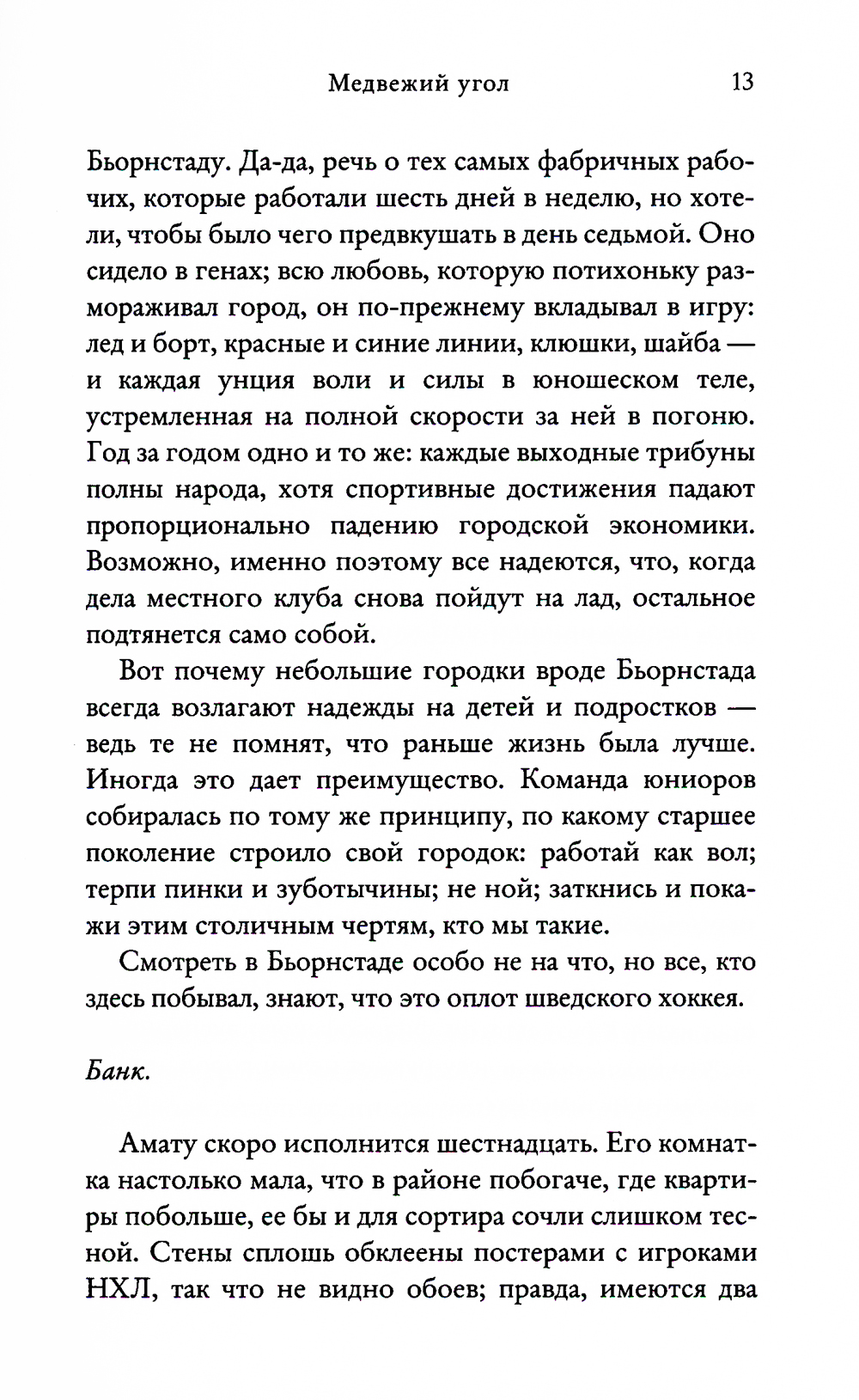 Захолустный Бьорнстад - Медвежий город - затерян в северной шведской глуши: дальше только непроходимые леса. Когда-то здесь кипела жизнь, а теперь царят безработица и безысходность. Последняя надежда жителей - местный юниорский хоккейный клуб, когда-то занявший второе место в чемпионате страны. Хоккей в Бьорнстаде - не просто спорт: вокруг него кипят нешуточные страсти, на нем завязаны все интересы, от него зависит, как сложатся судьбы. День победы в матче четвертьфинала стал самым счастливым и для города, и для руководства клуба, и для команды, и для ее семнадцатилетнего капитана Кевина Эрдаля. Но для пятнадцатилетней Маи Эриксон и ее родителей это был страшный день, перевернувший всю их жизнь... Перед каждым жителем города встала необходимость сделать моральный выбор, ответить на вопрос: какую цену ты готов заплатить за победу?| Издательство | Синдбад |