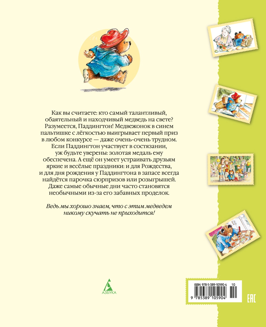 Как вы считаете: кто самый талантливый, обаятельный и находчивый медведь на свете? Разумеется, Паддингтон! Медвежонок в синем пальтишке с лёгкостью выигрывает первый приз в любом конкурсе - даже очень-очень трудном. Если Паддингтон участвует в состязании, уж будьте уверены: золотая медаль ему обеспечена. А ещё он умеет устраивать друзьям яркие и весёлые праздники: и для Рождества и для дня рождения у Паддингтона в запасе всегда найдётся парочка сюрпризов или розыгрышей. Даже самые обычные дни часто становятся необычными из-за его забавных проделок - ведь мы хорошо знаем, что с этим медведем никому скучать не приходится!| Издательство | Азбука |