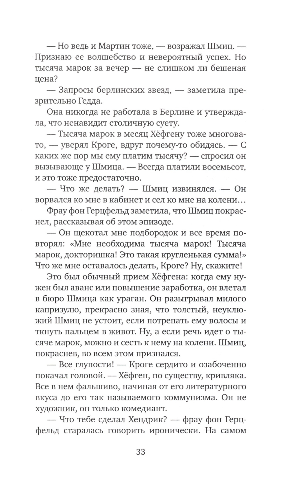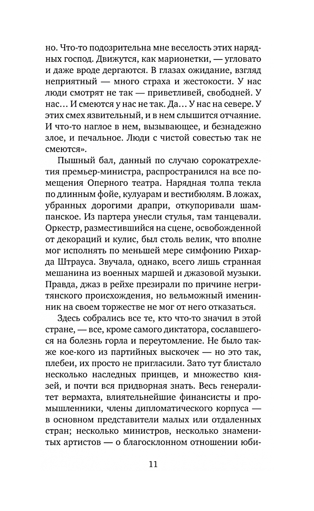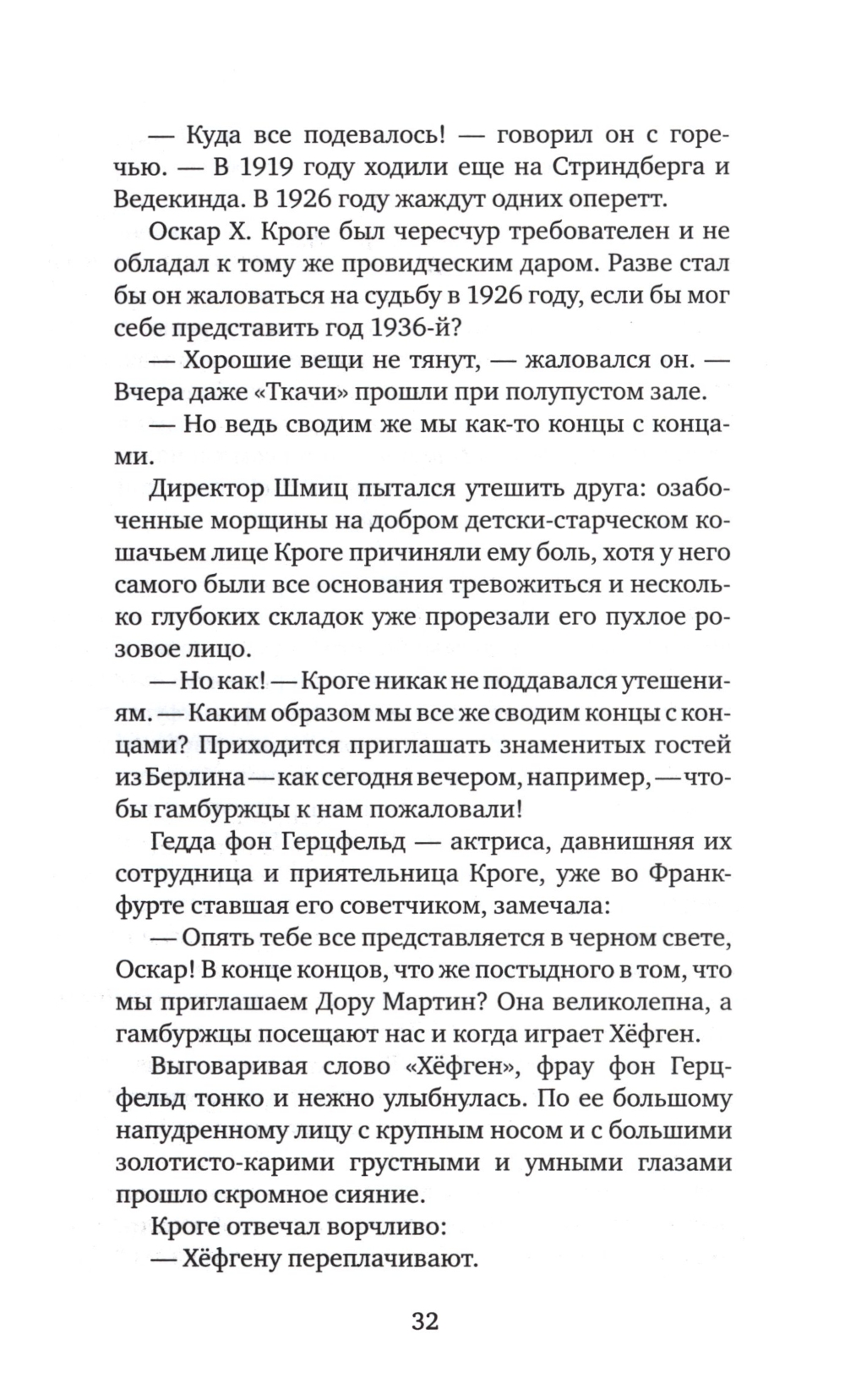 Физическая близость власти смущала и пугала его. Невероятная слава человека, сидевшего напротив, пугала честолюбца. А под незначительным покатым лбом власти, на который ниспадала легендарная сальная прядь, был мертвый, неподвижный, словно слепой взгляд. Лицо у власти было серо-белое, оплывшее, рыхлое и пористое. У власти был очень вульгарный нос - «гнусный нос», осмелился подумать Хендрик. К восторгу примешивалось чувство протеста, даже презрения. Артист заметил, что у власти вовсе нет затылка. Под коричневой рубашкой выступал мягкий живот. Говорила власть тихо, берегла свой осипший, хриплый голос. Она употребляла трудные слова, демонстрировала артисту «образованность».| Издательство | Текст |