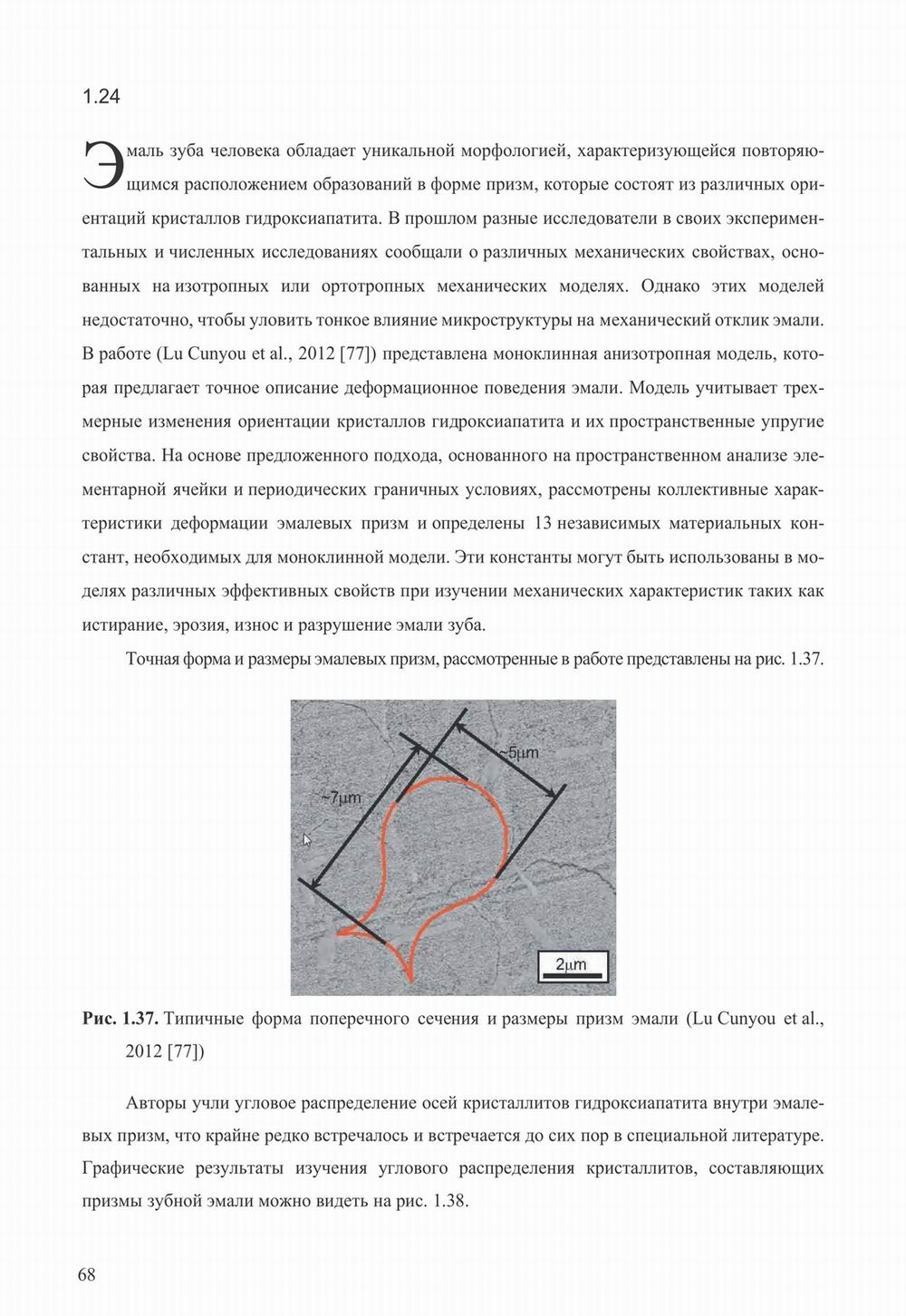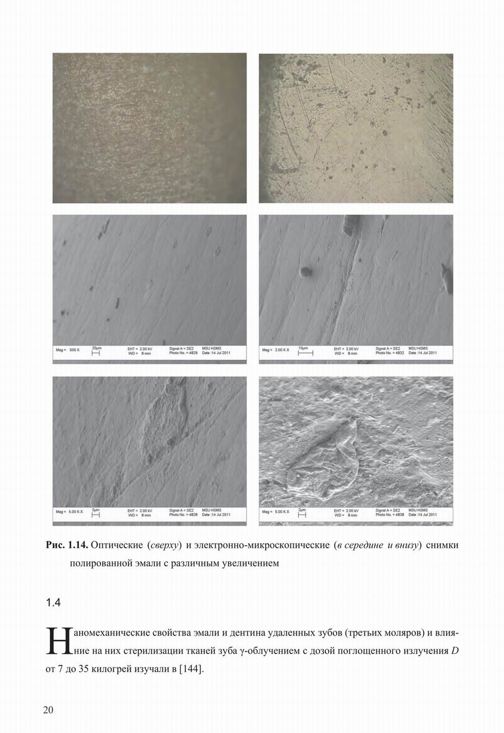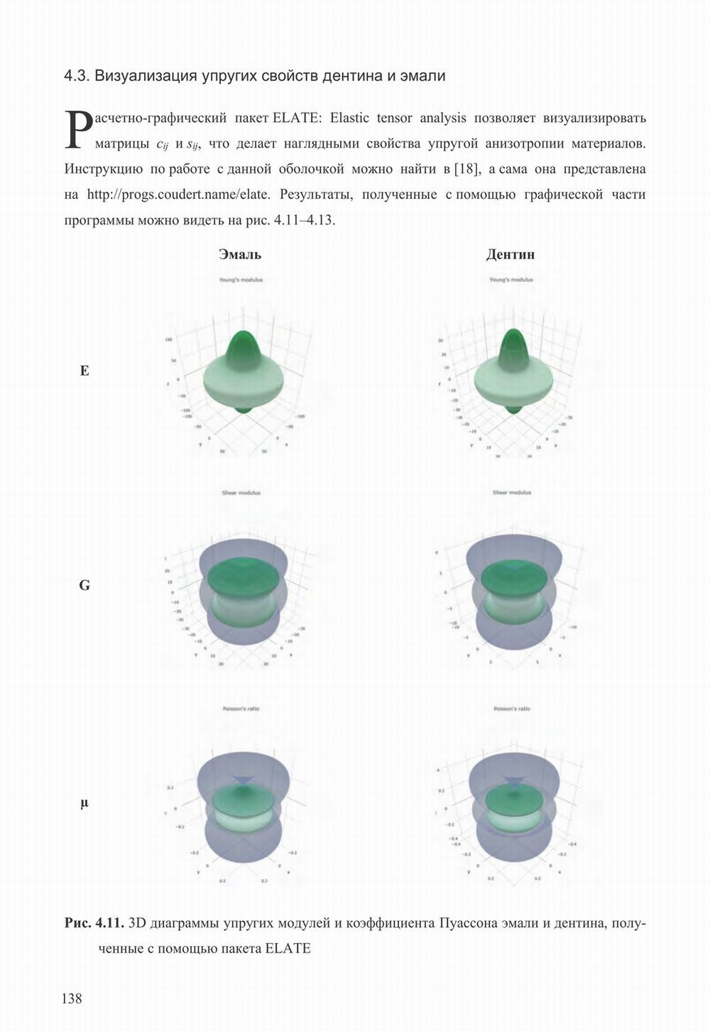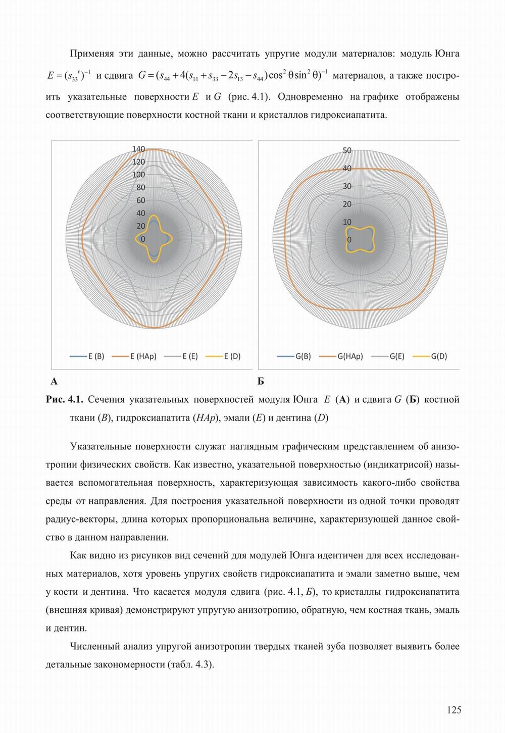 Описаны результаты измерения упругих моду лей и нанотвердости интактной эмали и эмали с кариесом, а также исследования нанотвердости эмали зубов после охлаждения до сверхнизких температур (4,2 К). Анализируются отношение H/E и вязкость разрушения эмали и дентина в сравнении с другими материалами. Визуализирована матрица упругих постоянных дентина и эмали. Рассмотрены упругие модули, параметры упругой анизотропии и коэффициент Пуассона дентина и эмали как анизотропных сред гексагональной сингонии. Возможность такого подхода объясняется данными о морфологии твердых тканей зуба как биокомпозита с коллагеновой матрицей и минеральной составляю щей в виде кристаллов апатитов. В рамках этой модели установлено, что коэффициент Пуассона дентина в некоторых направлениях выше теоретического предела 0,5 для изотропных материалов, в том числе композиционных, что может сказываться на качестве реставраций. Также установлено, что минимальные значения коэффициента Пуассона дентина и эмали больше нуля, то есть и дентин, и эмаль не являются ауксетиками - материалами с отрицательным коэффициентом Пуассона. Приведены данные по упругим свойствам и прочности околозубных тканей, периодонтальной связки и слизистой оболочки рта, а также кристаллов гидроксиапатита. Исследовано влияние пищевой диеты (напитков, молока и молочных продуктов, сыра, сахара и сладостей) и средств гигиены на твердость и шероховатость зубной эмали. Выполнено сравнение твердости эмали зубов человека и различных видов животных (растительноядных, плотоядных и морских). Установлено, что физико- механические свойства зубной эмали человека уникальны: они занимают достойное место на диаграмме «твердость - модуль упругости» биоминералов и других материалов, а по механическим характеристикам превосходят соответствующие показатели эмали зубов акул, ядовитых клыков кобры - самых опасных змей на земле и не уступают по твердости эмали клыков крыс - одних из наиболее живучих млекопитающих на планете и гиен с мощнейшими челюстями и невероятной жестокостью. Приведены начальные сведения из механики.