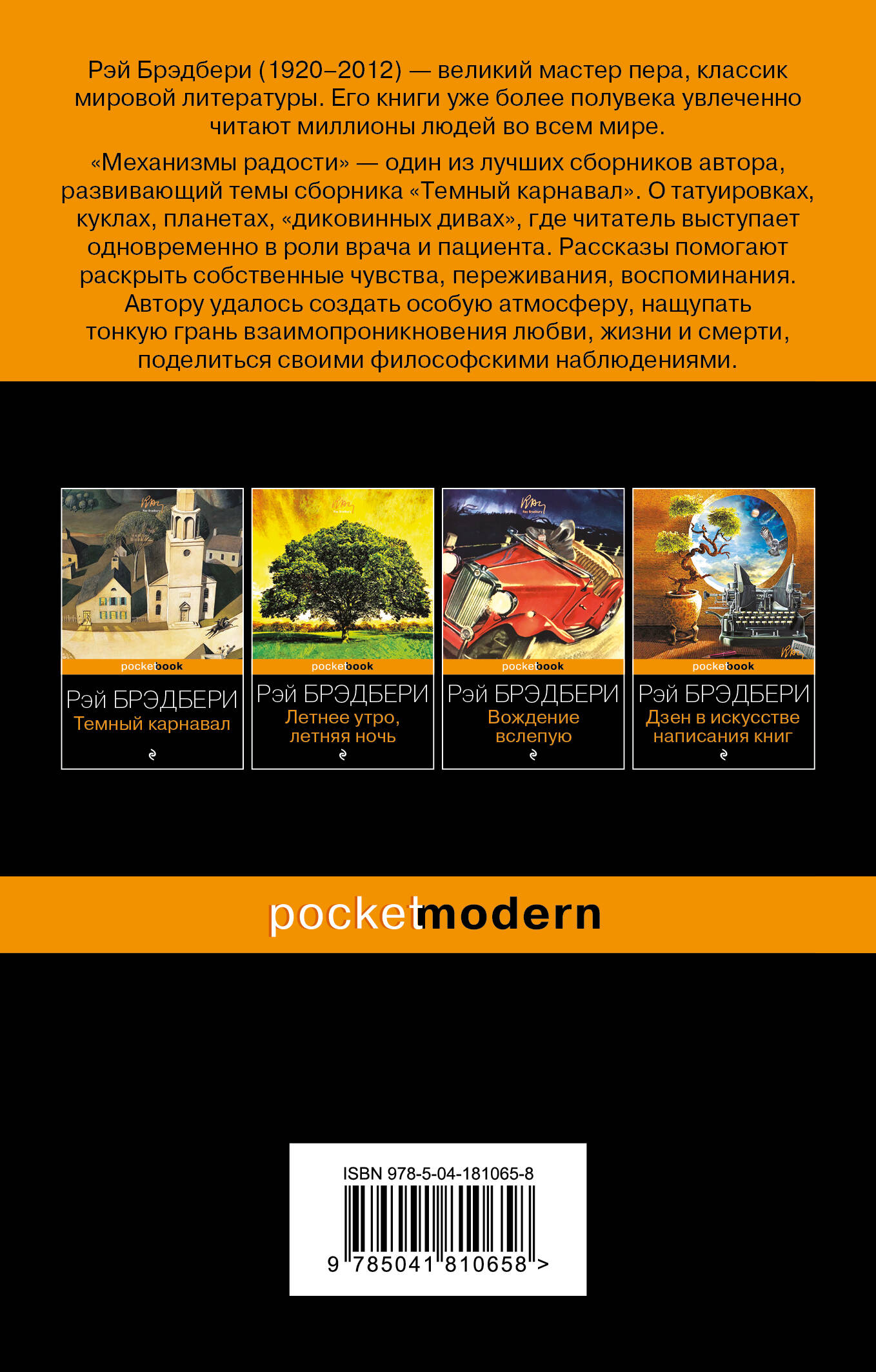 У этих механизмов никогда не бывает сбоев. Они вечны, как вечный двигатель и снега на вершине Килиманджаро. Потому что человек, их создавший, один из лучших в мире выдумщиков небывалых вещей, Рэй Брэдбери, писатель, фантаст, поэт, для которого создавать механизмы радости такое же привычное ремесло, как для пекаря делать хлеб, а для винодела - вино.| Издательство | ООО "Издательство "Эксмо" |