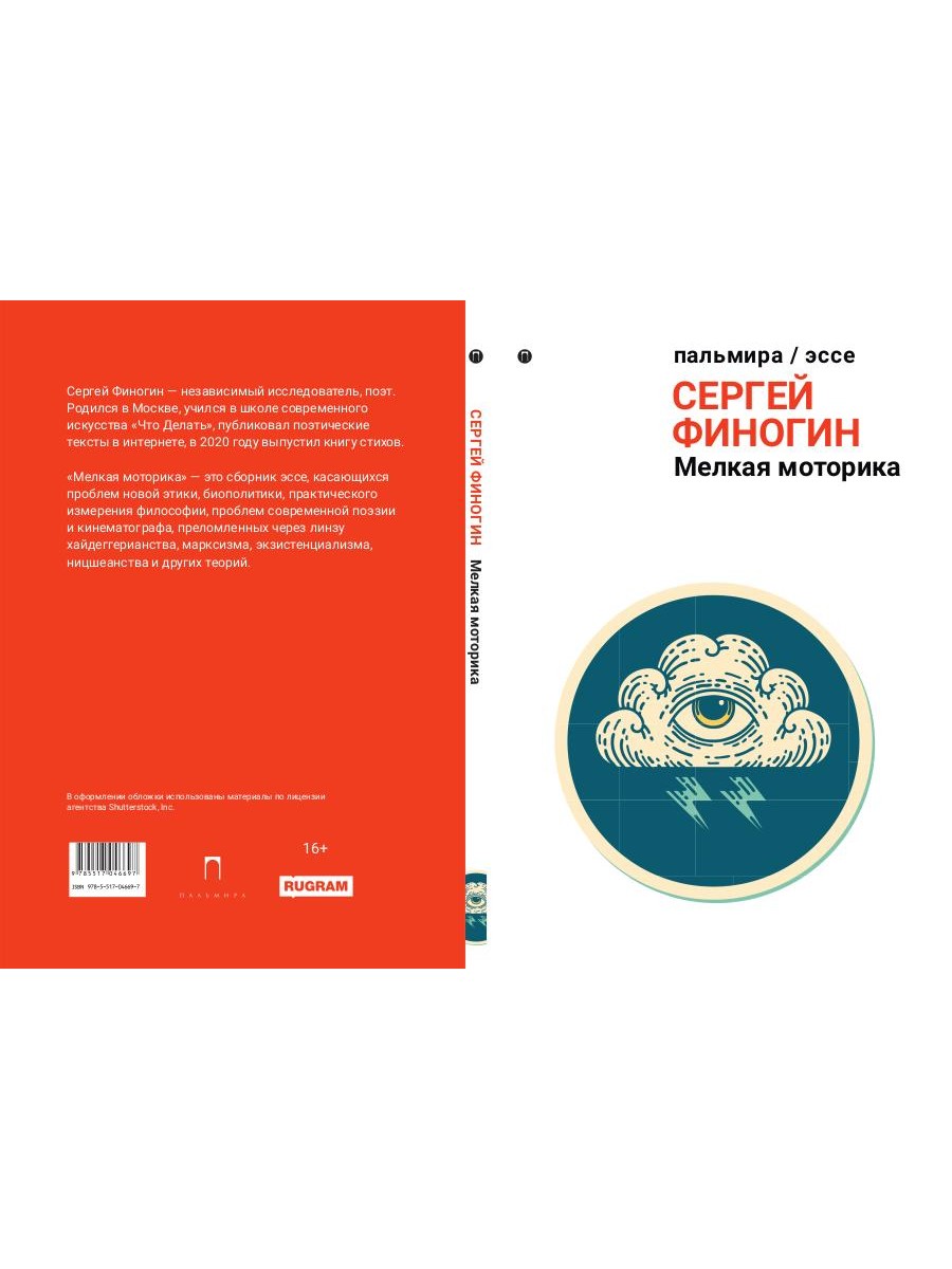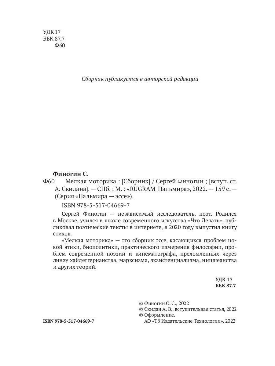 Сергей Финогин - независимый исследователь, поэт. Родился в Москве, учился в школе современного искусства «Что Делать», публиковал поэтические тексты в интернете, в 2020 году выпустил книгу стихов. «Мелкая моторика» - это сборник эссе, касающихся проблем новой этики, биополитики, практического измерения философии, проблем современной поэзии и кинематографа, преломленных через линзу хайдеггерианства, марксизма, экзистенциализма, ницшеанства и других теорий.| Издательство | Т8 RUGRAM |