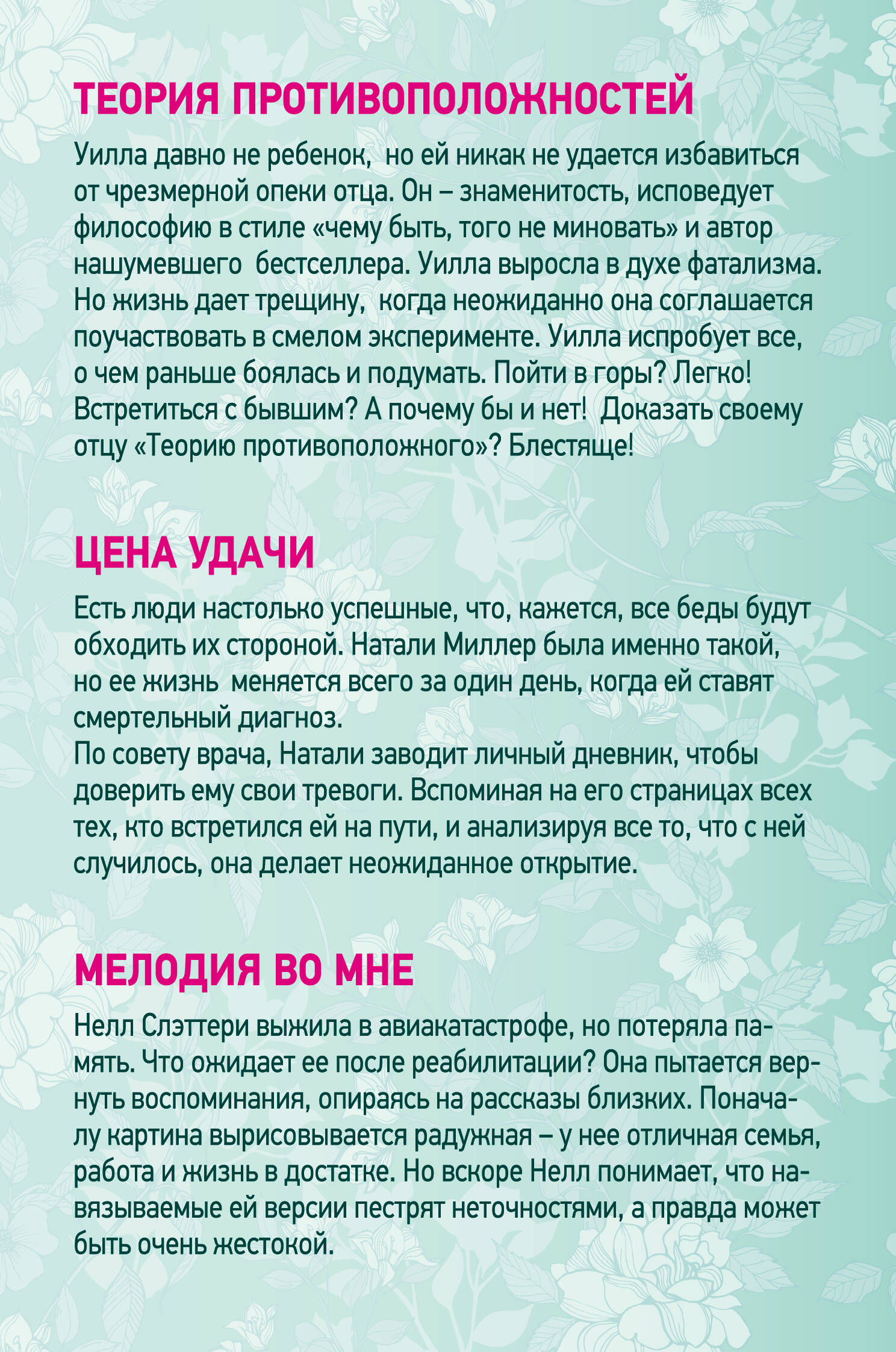 Комплект из 3-х книг: "Теория противоположностей", "Цена удачи", "Мелодия во мне". Теория противоположностей Уилла уже давно не ребенок, но ей никак не удается избавиться от чрезмерной опеки отца. Ее родитель - знаменитость, без пяти минут нобелевский лауреат, исповедующий философию в стиле "чему быть, того не миновать" и автор нашумевшего бестселлера. Уилла выросла в духе фатализма и большую часть жизни плывет по течению. Скучная работа, рутинные отношения с мужем, отсутствие ярких эмоций... Но размеренный быт дает трещину, когда неожиданно для самой себя она соглашается поучаствовать в смелом эксперименте. Уилла испробует все, о чем раньше боялась и подумать. Пойти в горы? Легко! Встретиться с бывшим? А почему бы и нет! Доказать своему отцу "Теорию противоположного"? Блестяще! Ее новый девиз: "Смелее!". Живи свободно! Твори! Люби себя! Путешествуй! Делай все, что хочешь. Но всегда ли нужно жить "от противного"? И как обрести гармонию с самой собой? Цена удачи Есть женщины настолько успешные, что, кажется, любые беды будут обходить их стороной. Натали Миллер была именно такой женщиной - судите сами: тридцать лет, помощник сенатора,безупречная внешность и сильный характер. Ее жизнь меняется всего за один день, когда ей ставят смертельный диагноз. От Натали уходит жених, начинаются проблемы на работе. Вскоре она остается наедине со своим горем, и ее жизнь становится такой же, как у большинства обычных людей: унылые будни, которые скрашивает лишь просмотр телевизора и походы к психотерапевту. По совету врача, Натали заводит личный дневник, чтобы доверить ему все свои тревоги и воспоминания. Заполняя дневник строка за строкой, Натали пытается понять, почему она, неcмотря на множество романов, осталась совсем одна. И вот, вспоминая всех тех, кто встретился ей на пути, и анализируя все то, что с ней случилось, она делает неожиданное открытие, которое, возможно, многое в ее жизни изменит. Мелодия во мне Нелл Слэттери выжила в авиакатастрофе, но потеряла память. Что ожидает ее после реабилитации? Она пытается вернуть воспоминания, опираясь на рассказы близких. Поначалу картина вырисовывается радужная - у нее отличная семья, работа и жизнь в достатке. Но вскоре Нелл понимает, что навязываемые ей версии пестрят неточностями, а правда может быть очень жестокой. Воспоминания пробиваются в затуманенное сознание Нелл благодаря песням - любимым композициям, каждая из которых как-то связана с эпизодом из ее жизни.| Издательство | ООО "Издательство "Эксмо" |