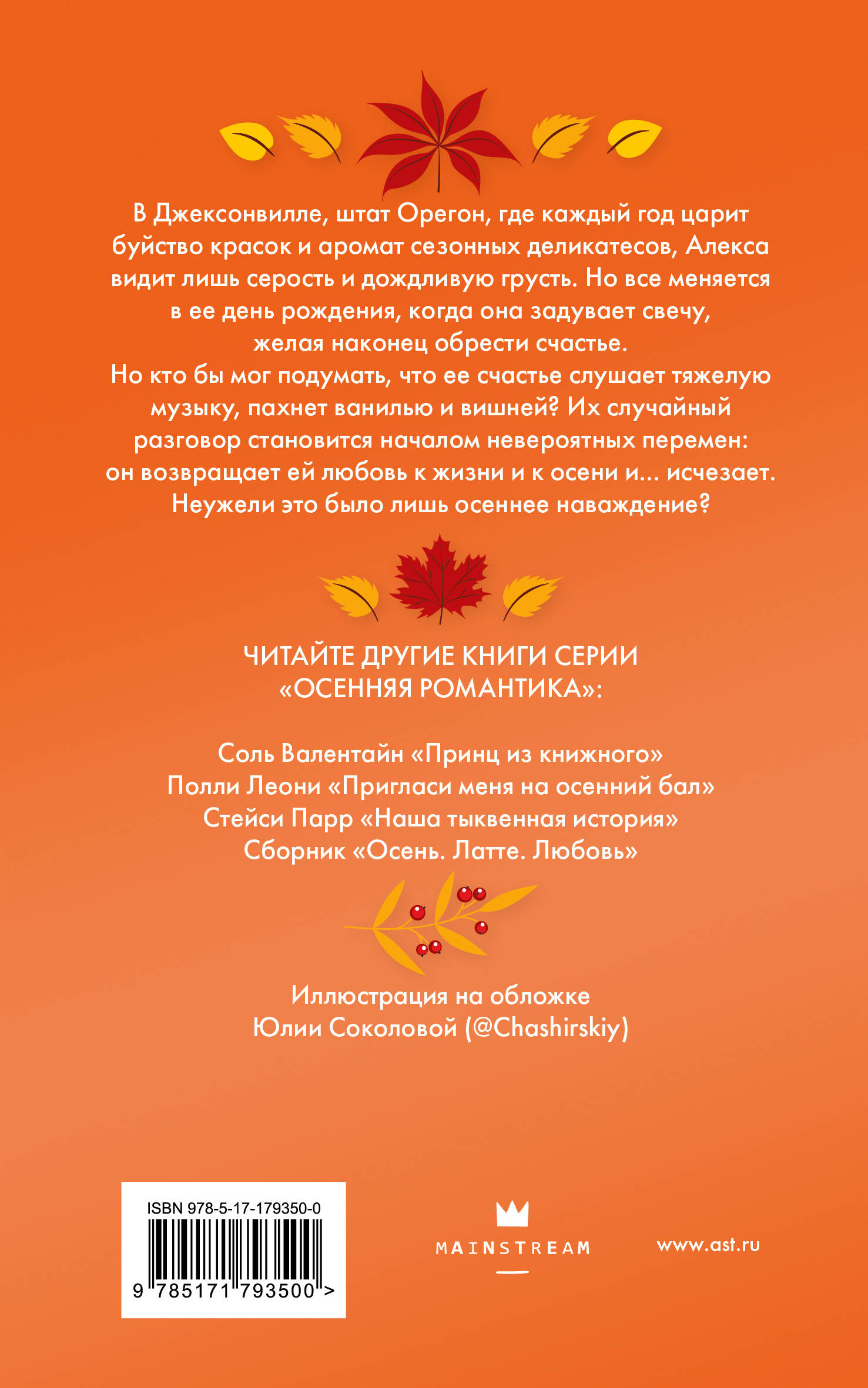 В Джексонвилле, штат Орегон, где каждый год царит буйство красок и аромат сезонных деликатесов, Алекса видит лишь серость и дождливую грусть. Но все меняется в ее день рождения, когда она задувает свечу, желая наконец обрести счастье. Но кто бы мог подумать, что ее счастье слушает тяжелую музыку, пахнет ванилью и вишней? Их случайный разговор становится началом невероятных перемен: он возвращает ей любовь к жизни и к осени и… исчезает. Неужели это было лишь осеннее наваждение?| Издательство | Издательство "АСТ" |