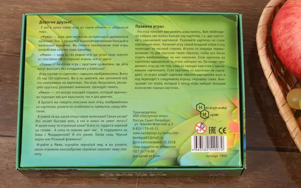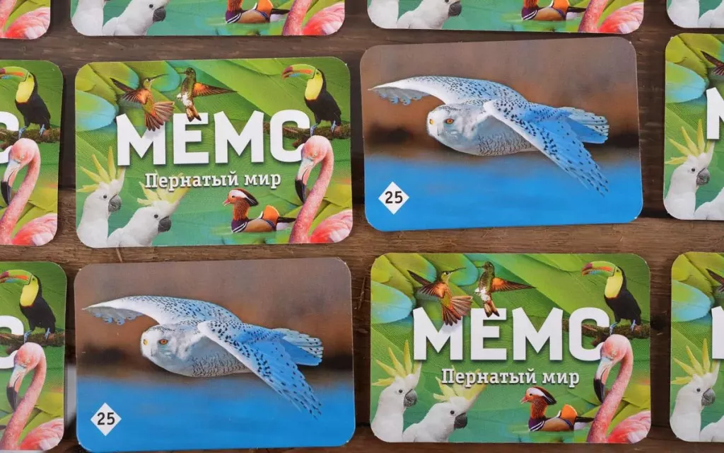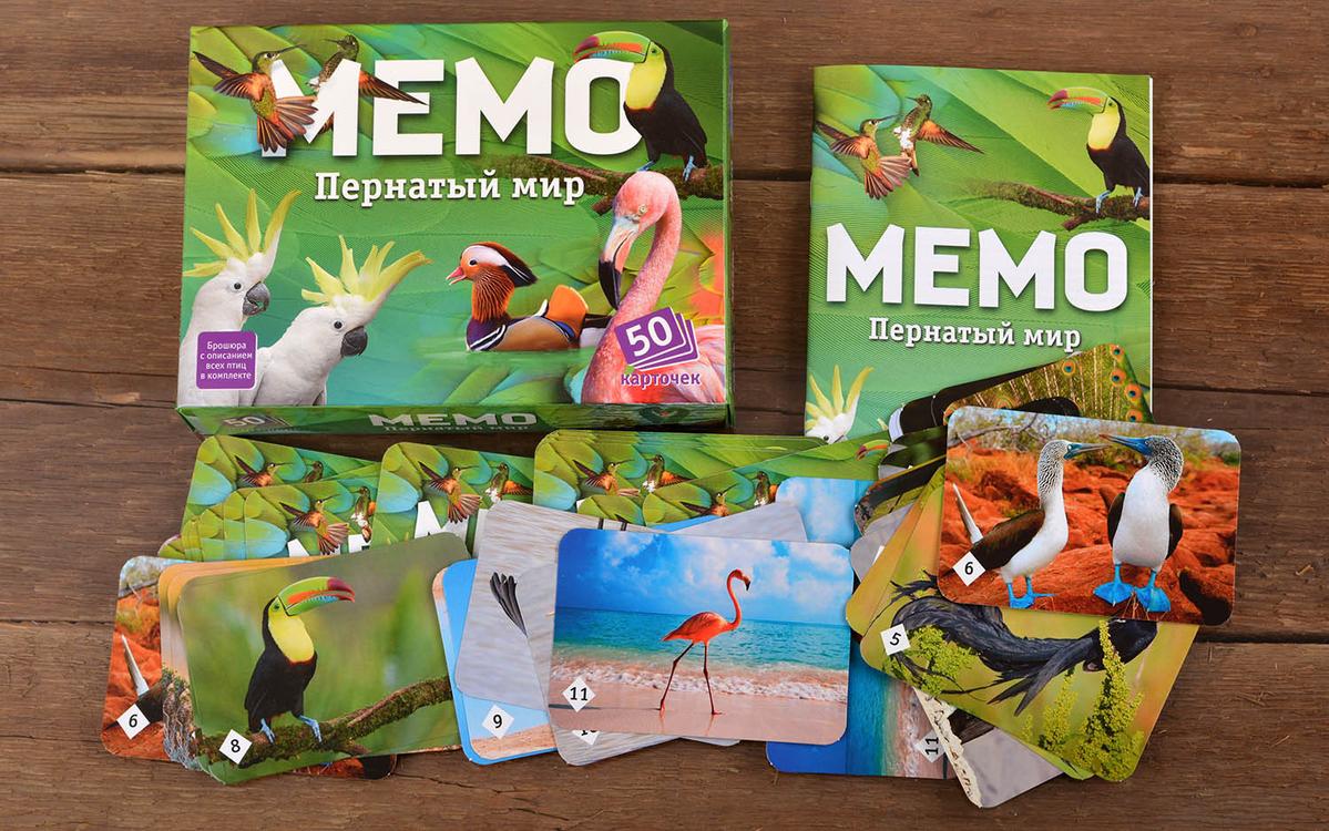 Мемо" - игра действительно занимательная и полезная! Она поднимет настроение любой комании. Вы станете почитателем этой игры, попробовав сыграть лишь однажды. "Мемо" - одна из тех необычных игр, где успех чаще зависит от способностей и стараний игрока, чем от удачи. "Мемо" - полезная игра с легкими правилами, где дети могут выиграть без "поддавков" у взрослых! Игра состоит из карточек с парными изображениями. Вы и не заметите, как запомните всё, что изображено на карточках. Перед началом игры карточки перемешиваются и раскладываются на столе картинками вниз. Играют несколько игроков. В свой ход игрок переворачивает 2 любые карточки и показывает их остальным игрокам. Если карточки одинаковые, игрок забирает их себе и делает еще один ход. Если разные - переворачивает их и кладет обратно, а ход переходит к следующему игроку. Выигрывает игрок, собравший к концу игры наибольшее количество карточек. В буклете вы найдёте описание всех птиц, изображённых на карточках, узнаете их особенности, привычки, среду обитания. А знаете ли вы, какая птица самая маленькая? Самая умная? Кто летает быстрее всех, а кто и вовсе не умеет летать? И зачем кому-то огромный клюв? А кто-то гордится короной на голове. А кому-то важнее цвет ног. А подружится ли Киви с Мандаринкой? И кто умнее: Белая сова, Чёрный ворон или Розовый фламинго?