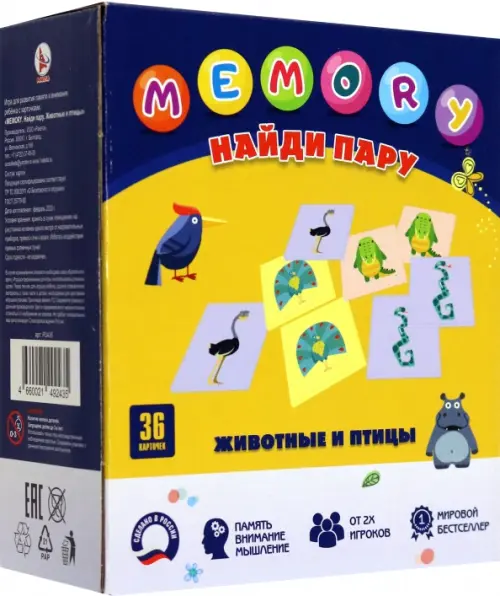 "Найди пару. MEMORY " развивает внимание, память и наблюдательность ребенка, а так же мелкую моторику. В набор входит 18 пар карточек. Два варианта игры: "Классический" и "Закрой глаза"