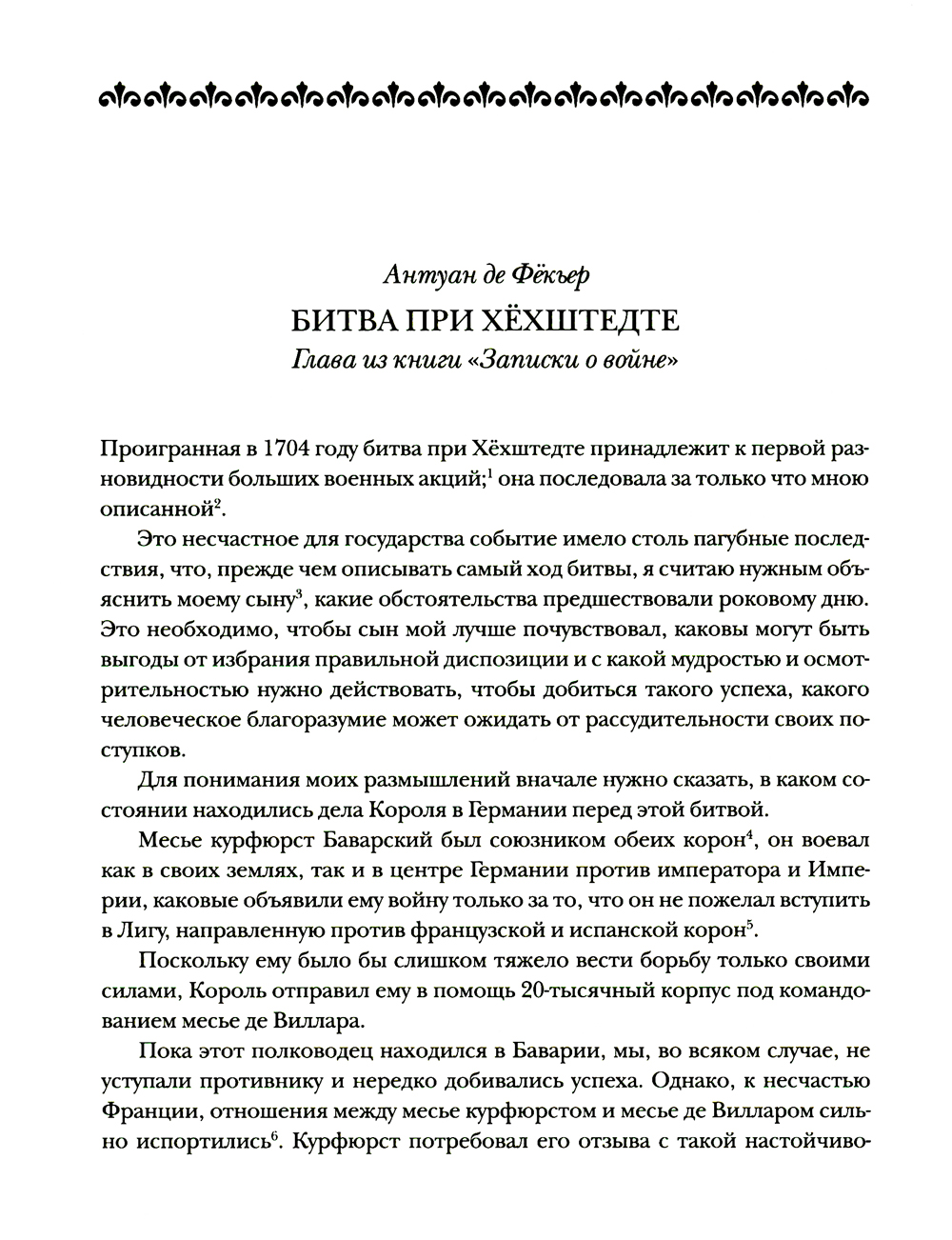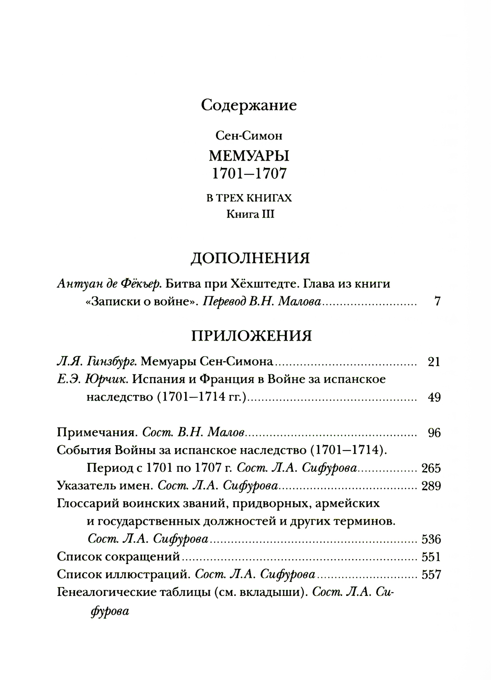 В данный том «Мемуаров» герцога де Сен-Симона (1675-1755) входят события, произошедшие с 1701-го - последнего, по выражению мемуариста, счастливого года в жизни Людовика XIV, - по 1707 год. В 1701 году началась Война за испанское наследство (1701-1714 гг.), и Сен-Симон подробно описывает и анализирует большие и малые баталии на разных театрах войны - в Германии, Фландрии, Испании и Северной Италии: сухопутные сражения при Карпи и Кьяри (1701 г.), при Луццаре и Фридлингене (1702 г.), при Хёхштедте (Бленхейме) (1703 г. и 1704 г.) и Шпейере (1703 г.), при Рамийи (1706 г.) и Альмансе (1707 г.), вылазку имперцев в Кремоне (1702 г.), битвы за Барселону (1705 г.) и Турин (1706 г.), бесчисленные осады городов, морские схватки в бухте Виго (1702 г.) и у Гибралтара (1704 г.) и многое другое. Автор рисует колоритные портреты французских военачальников высокого и низкого ранга; рассуждает о патриотизме; наглядно показывает, как личные качества полководцев и чиновников, ответственных за снабжение войск, влияли на исход сражений и целых военных кампаний, во время которых храбрость соседствовала с трусостью, а верность долгу - с предательством. Литературное дарование мемуариста разворачивается во всю мощь, когда он рассказывает о преследовавших Францию горестных поражениях и о редких в те годы победах. Наряду с персонажами, уже участвовавшими в событиях, охваченных первым томом, впервые появляются в повествовании или начинают действовать гораздо активнее и многие другие личности, выдвинувшиеся на авансцену истории в переломные моменты: полководцы Евгений Савойский и его кузен Людвиг Ба-денский, герцог Мальборо и целая плеяда маршалов Франции, эрцгерцог Карл, принцесса Орсини, Ференц Ракоци, шведский король Карл XII, Антоний Гейнзи-ус, английская королева Анна, герцог Савойский и курфюрст Баварский... Обращение к перипетиям «большой» и «малой» истории диктует многоплановость повествования, поэтому масштабные исторические события перемежаются в «Мемуарах» с частными эпизодами из жизни двора и отдельных семейств, сообщениями о политических дрязгах и интригах, историческими анекдотами. Сен-Симон подробно разбирает вопросы церемониала (на сей раз - испанского), взаимоотношения Церкви и государства, судебные процессы, в том числе проходившие с его личным участием. Издание содержит две научные статьи (о литературной стороне «Мемуаров» Сен-Симона и о Войне за испанское наследство, рассмотренной с «испанской» точки зрения), развернутые примечания, аннотированный указатель имен, генеалогические таблицы, географические карты, иллюстрации и другие вспомогательные материалы.| Издательство | Ладомир |