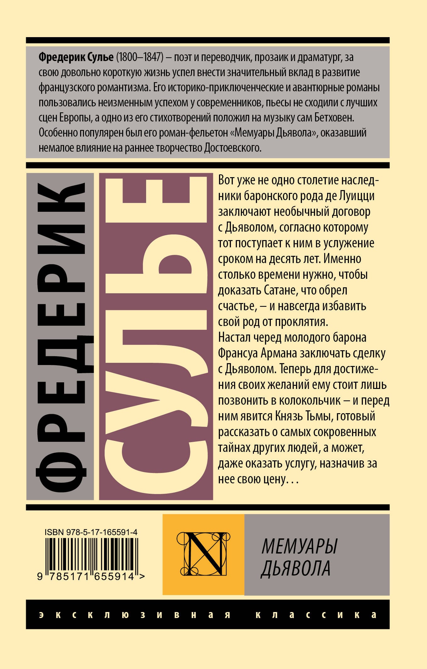 Французский писатель Фредерик Сулье пользовался огромной популярностью среди современников. Он добился успеха в массовой беллетристике раньше Александра Дюма, французские читатели ставили его труды выше произведений Бальзака. Пьесы Сулье ставились на лучших европейских сценах, его книги неоднократно переиздавались и переводились на другие языки, в том числе и на русский. Из русских авторов книгами Сулье увлекался Федор Михайлович Достоевский, часто ссылавшийся на «Мемуары дьявола» в «Дневнике писателя». «Мемуары Дьявола» - самая известная книга Сулье, увлекательная смесь готической литературы, исторического и социального романа.