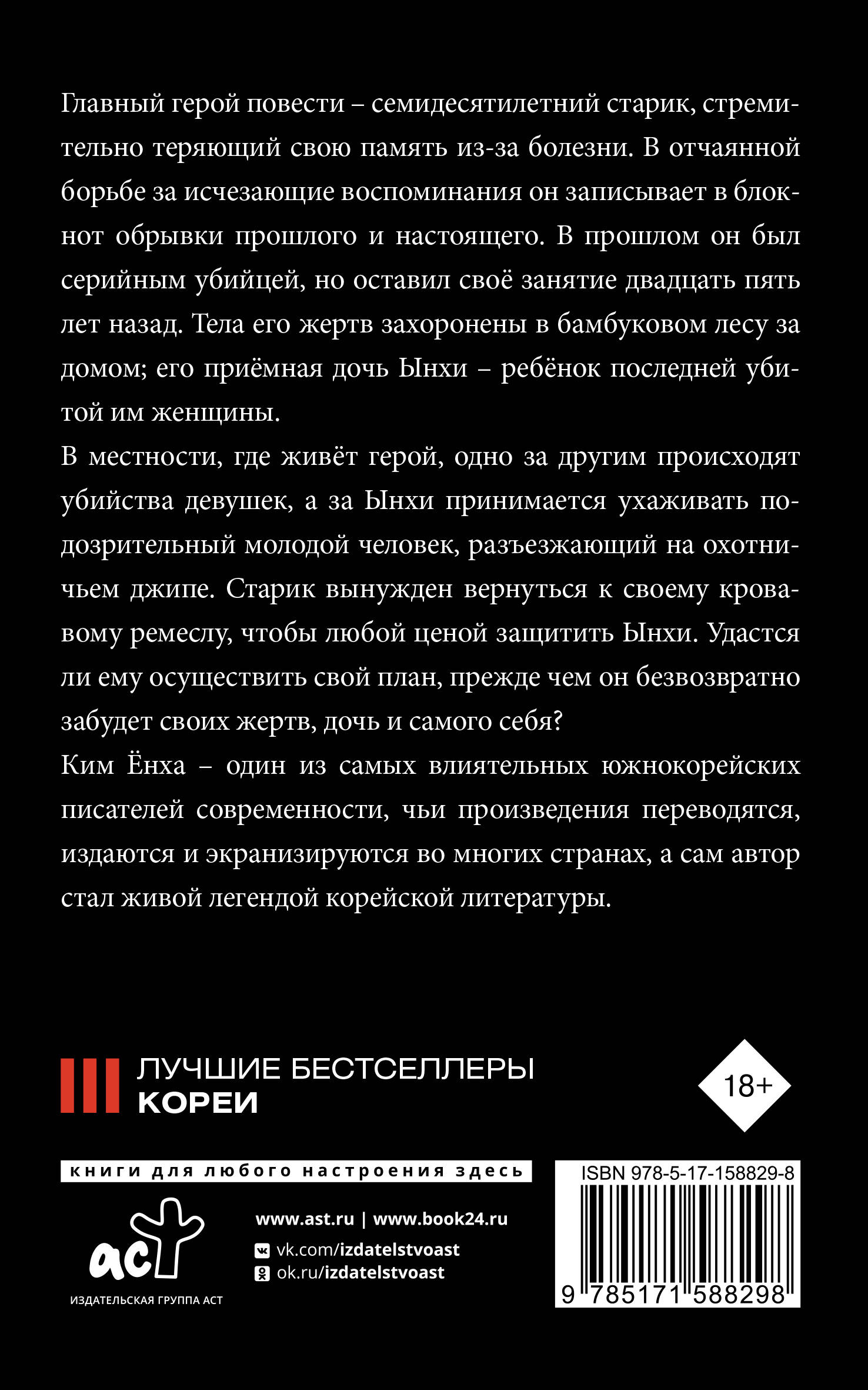 Главный герой повести - семидесятилетний старик, стремительно теряющий свою память из-за болезни. В отчаянной борьбе за исчезающие воспоминания он записывает в блокнот обрывки прошлого и настоящего. В прошлом он был серийным убийцей, но оставил своё занятие двадцать пять лет назад. Тела его жертв захоронены в бамбуковом лесу за домом; его приёмная дочь Ынхи - ребёнок последней убитой им женщины. В местности, где живёт герой, одно за другим происходят убийства девушек, а за Ынхи принимается ухаживать подозрительный молодой человек, разъезжающий на охотничьем джипе. Старик вынужден вернуться к своему кровавому ремеслу, чтобы любой ценой защитить Ынхи. Удастся ли ему осуществить свой план, прежде чем он безвозвратно забудет своих жертв, дочь и самого себя? Ким Ёнха - один из самых влиятельных южнокорейских писателей современности, чьи произведения переводятся, издаются и экранизируются во многих странах, а сам автор стал живой легендой корейской литературы.