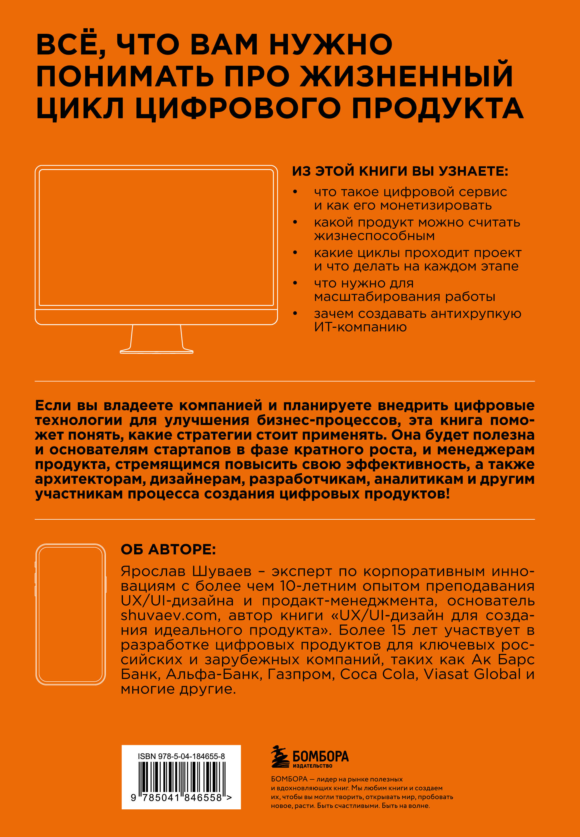 Всё, что вам нужно понимать про жизненный цикл цифрового продукта. Из этой книги вы узнаете: • что такое цифровой сервис и как его монетизировать; • какой продукт можно считать жизнеспособным; • какие циклы проходит проект и что делать на каждом этапе; • что нужно для масштабирования работы; • зачем создавать антихрупкую ИТ-компанию. Если вы владеете компанией и планируете внедрить цифровые технологии для улучшения бизнес-процессов, эта книга поможет понять, какие стратегии стоит применять. Она будет полезна и основателям стартапов в фазе кратного роста, и менеджерам продукта, стремящимся повысить свою эффективность, а также архитекторам, дизайнерам, разработчикам, аналитикам и другим участникам процесса создания цифровых продуктов. Об авторе ЯРОСЛАВ ШУВАЕВ - эксперт по корпоративным инновациям с более чем 10-летним опытом преподавания UX/UI-дизайна и продакт-менеджмента, основатель shuvaev.com, автор книги «UX/UI дизайн для создания идеального продукта». Более 15 лет участвует в разработке цифровых продуктов для ключевых российских и зарубежных компаний, таких как Ак Барс Банк, Альфа Банк, Газпром, Coca Cola, Viasat Global и многих других.| Издательство | ООО "Издательство "Эксмо" |