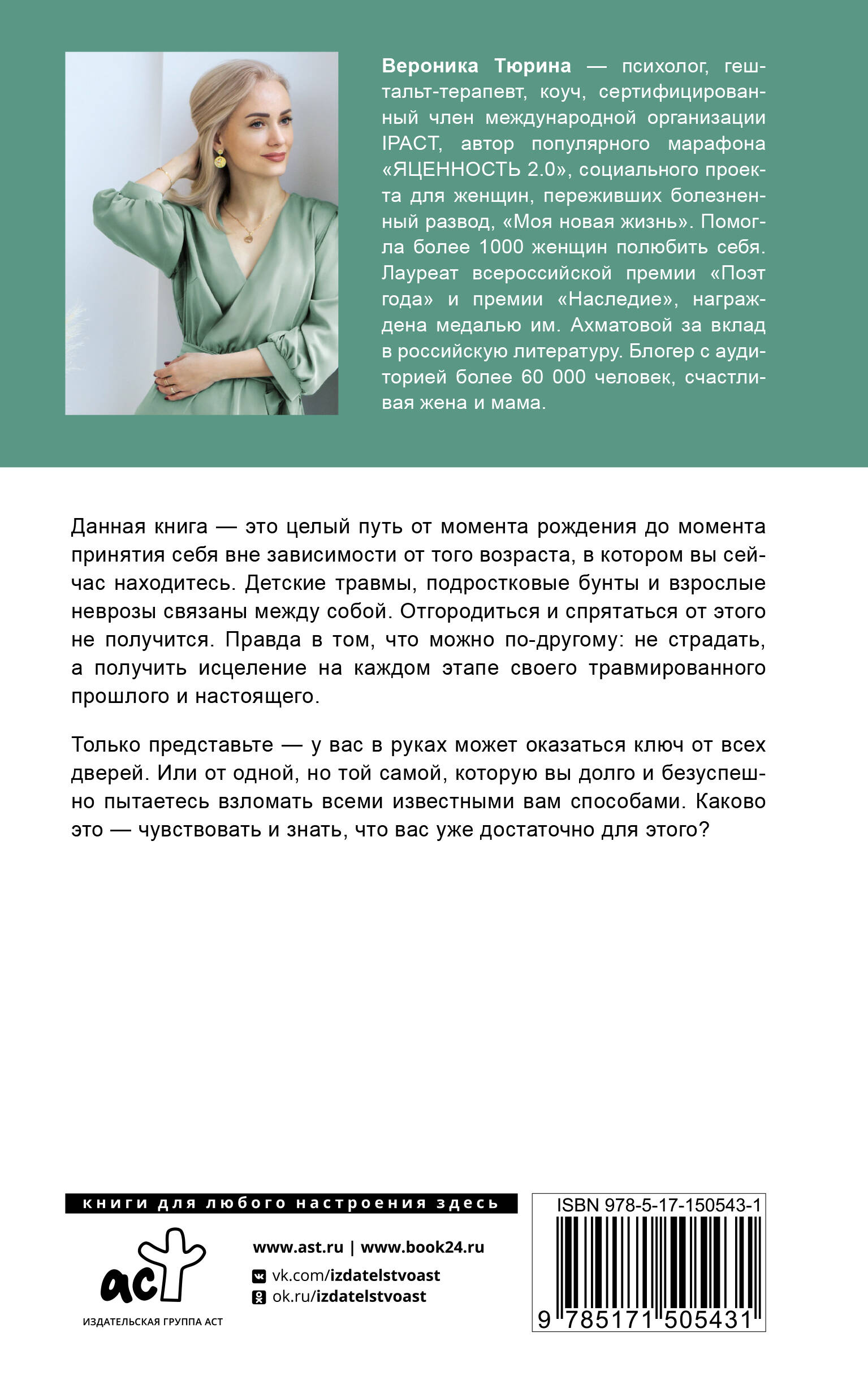 Вероника Тюрина - психолог, гештальт-терапевт, коуч, сертифицированный член международной организации IPACT, автор популярного марафона "ЯЦЕННОСТЬ 2.0", социального проекта для женщин, переживших болезненный развод, "Моя новая жизнь". Помогла более 1000 женщин полюбить себя. Лауреат всероссийской премии "Поэт года" и премии "Наследие", награждена медалью им. Ахматовой за вклад в российскую литературу. Блогер с аудиторией более 60 000 человек, счастливая жена и мама. Данная книга - это целый путь от момента рождения до момента принятия себя вне зависимости от того возраста, в котором вы сейчас находитесь. Детские травмы, подростковые бунты и взрослые неврозы связаны между собой. Отгородиться и спрятаться от этого не получится. Правда в том, что можно по-другому: не страдать, а получить исцеление на каждом этапе своего травмированного прошлого и настоящего. Только представьте - у вас в руках может оказаться ключ от всех дверей. Или от одной, но той самой, которую вы долго и безуспешно пытаетесь взломать всеми известными вам способами. Каково это - чувствовать и знать, что вас уже достаточно для этого?| Издательство | АСТ |