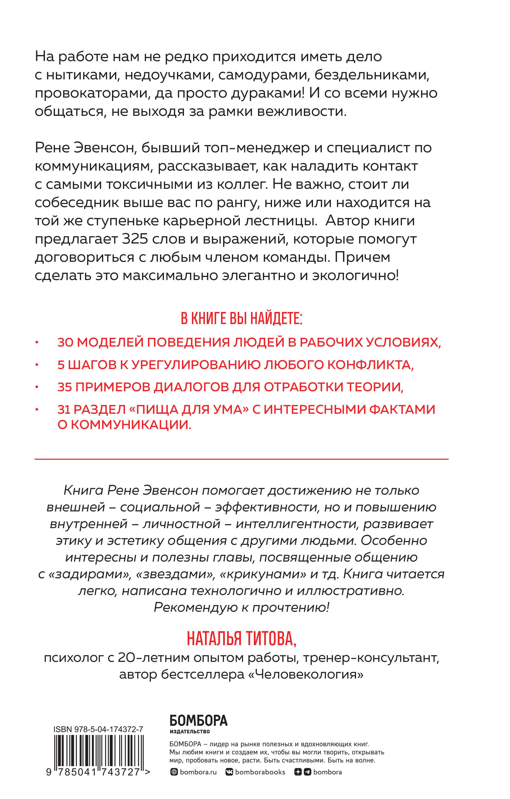 На работе нам нередко приходится иметь дело с нытиками, недоучками, самодурами, бездельниками, провокаторами, да просто дураками! И со всеми нужно общаться, не выходя за рамки вежливости. Рене Эвенсон, бывший топ-менеджер и специалист по коммуникациям, рассказывает, как наладить контакт с самыми токсичными из коллег. Не важно, стоит ли собеседник выше вас по рангу, ниже или находится на той же ступеньке карьерной лестницы. Автор книги предлагает 325 слов и выражений, которые помогут договориться с любым членом команды. Причем сделать это максимально элегантно и экологично! В книге вы найдете: - 30 моделей поведения людей в рабочих условиях. - 5 шагов к урегулированию любого конфликта. - 35 примеров диалогов для отработки теории. - 31 раздел «пища для ума» с интересными фактами о коммуникации.| Издательство | ООО "Издательство "Эксмо" |