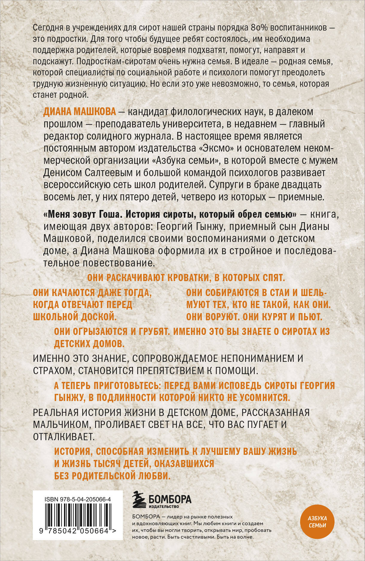 Они раскачивают кроватки, в которых спят. Они качаются даже тогда, когда отвечают перед школьной доской. Они собираются в стаи и шельмуют тех, кто не такой, как они. Они воруют. Они курят и пьют. Они рано начинают половую жизнь. Они огрызаются и грубят. Именно это вы знаете о сиротах из детских домов. Именно это знание, сопровожденное непониманием и страхом, становится препятствием в усыновлении. А теперь приготовьтесь: перед вами исповедь сироты Георгия Гынжу, в подлинности которой никто не усомнится. Реальная история жизни в детском доме, рассказанная мальчиком, проливает свет на все, что вас пугает и отталкивает. История, способная изменить к лучшему вашу жизнь и жизни тысячи детей, оказавшихся без родительской любви. 1. Диана Машкова обладает уникальным и профессиональным, и жизненным опытом. Вместе с супругом они усыновили троих детей. Основатель клуба «Азбука приемной семьи». Диана в своем творчестве постоянно обращается к проблемам детей-сирот. Благодаря ее книгам множество детей и родителей нашли путь друг к другу. 2. Это true-story: исповедь приемного сына Дианы Машковой Георгия Гынжу, выстроенная в последовательное повествование. 3. Подлинность и честность рассказчика потрясают. 4. Книга развенчивает страхи в отношении детей-сирот и спасает души.| Издательство | ООО "Издательство "Эксмо" |