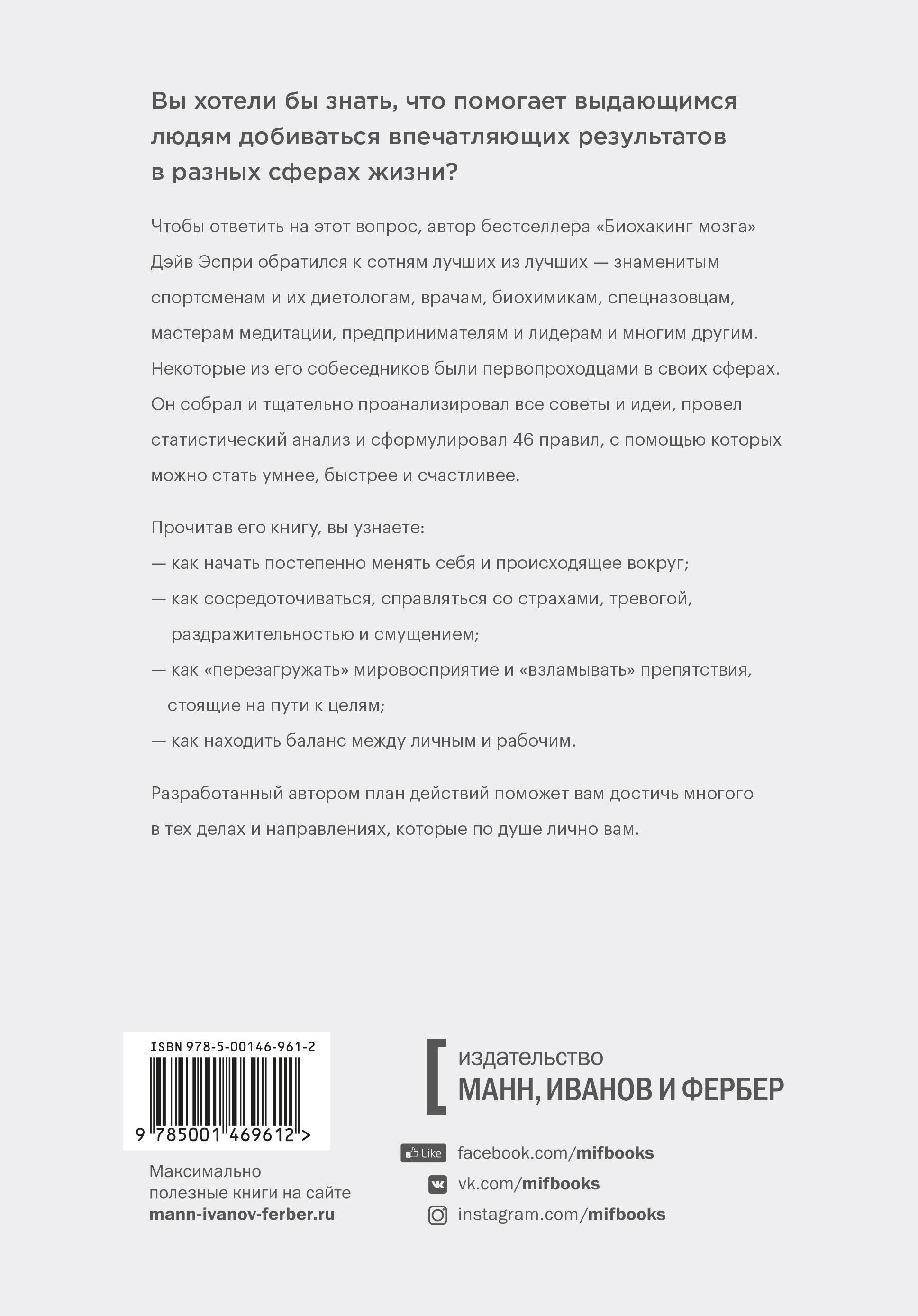 Представьте, что 450 успешных, выдающихся людей согласились по очереди встретиться с вами лично и поговорить. Скорее всего, вы бы захотели узнать, какие секреты и принципы помогают им добиваться впечатляющих результатов в разных сферах жизни. Дэйв Эспри именно это и сделал. Он взял интервью у лучших из лучших в разных профессиях, причем некоторые из его собеседников были первопроходцами в своих сферах деятельности: смелые исследователи, чьи идеи шли вразрез с основными направлениями научной мысли, знаменитые спортсмены, биохимики и врачи-новаторы, нашедшие новые способы борьбы с болезнями, лидеры в индустрии личностного роста, а еще писатели, художники, яркие представители делового мира и многие другие, кто мог поделиться чем-то важным и полезным. Затем он проанализировал все советы и идеи и сформулировал 46 правил, с помощью которых можно стать умнее, быстрее и счастливее. В своей книге он предлагает схему, позволяющую достичь многого в тех делах и направлениях, которые по душе лично вам. Фишки книги: Содержит рекомендации для чтения и прослушивания, что способствует более полному погружению в материал книги. Для кого книга: Для тех, кто хочет получить новые знания и методики для саморазвития. Для тех, кто ищет новые пути для развития. Для тех, кто ищет вдохновения для новых свершений.| Издательство | МИФ ООО |