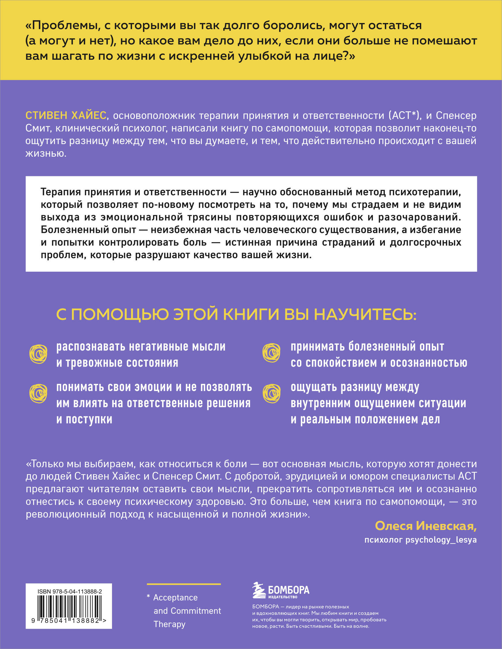 «Эта книга о том, как перейти от страданий к жизни. О том, как жить здесь и сейчас, как помириться со своим прошлым и принять его вместе с воспоминаниями, страхами и грустью». Проблемы наваливаются одна за другой и вы чувствуете, что утопаете в эмоциональной трясине. Вы пытаетесь бороться с болью, но становится только хуже. Что нужно сделать чтобы выбраться из плена тревожных мыслей и обрести душевное спокойствие? Книга Стивена Хайса, основоположника Терапии Принятия и Ответственности (АСТ), и Спенсера Смита, клинического психолога, научит вас жить полной и достойной жизнью, и оставить боль, с которой вы так долго сражались. Авторы предлагают использовать проверенную годами методику АСТ, которая позволит по-новому взглянуть на то, что такое психическое здоровье и почему мы страдаем. Из этой книги вы узнаете: Как распознавать негативные мысли и тревожные состояния? Как понимать свои эмоции и не позволять им влиять на ответственные решения и поступки? Как принимать болезненный опыт с осознанность и спокойствием? Как найти правду между собственным ощущением ситуации и реальным положением дел?| Издательство | ООО "Издательство "Эксмо" |